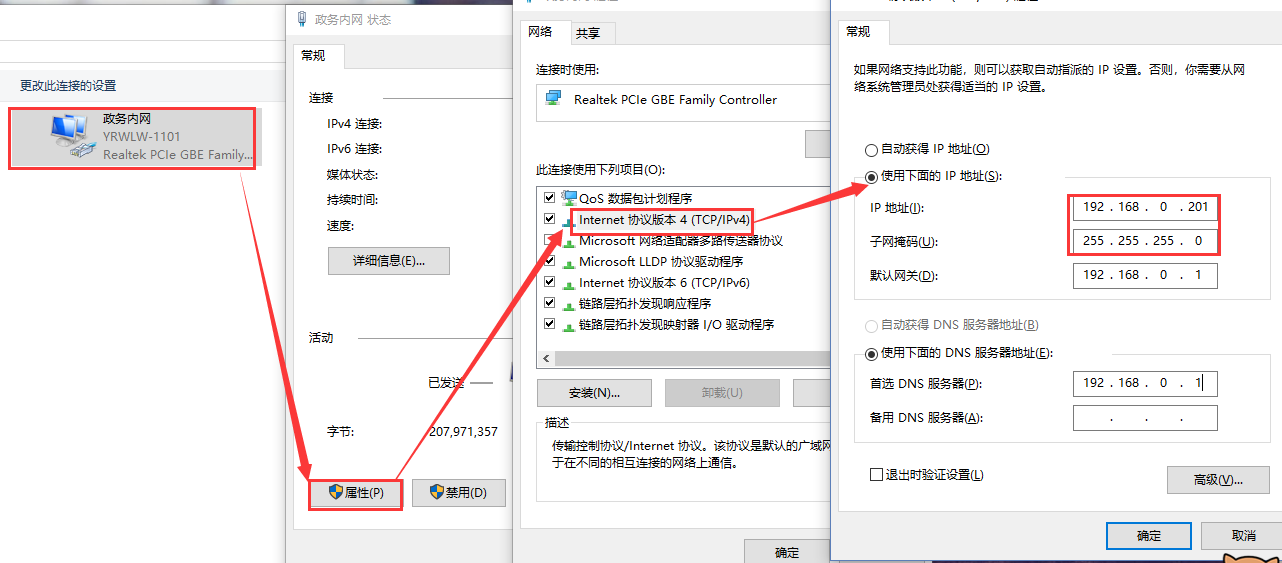 3. 给电脑设置静态IP,要与N510的IP在同一个网段(N510的IP地址出厂默认:192.168.0.7)