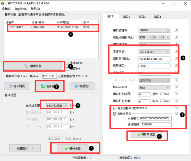 1. 设置N540参数,将网线与电脑直连,搜索设备,将ip改为动态,模块工作方式改为client,目标地址为有人云地址clouddata.usr.cn,端口为15000