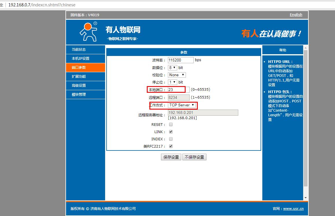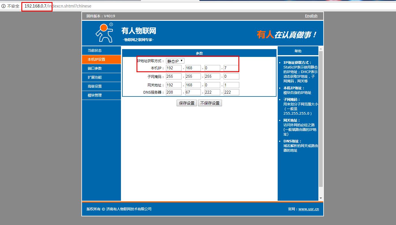在电脑打开浏览器,输入静态IP192.168.0.7 登录USR-TCP232-304的内置网页。