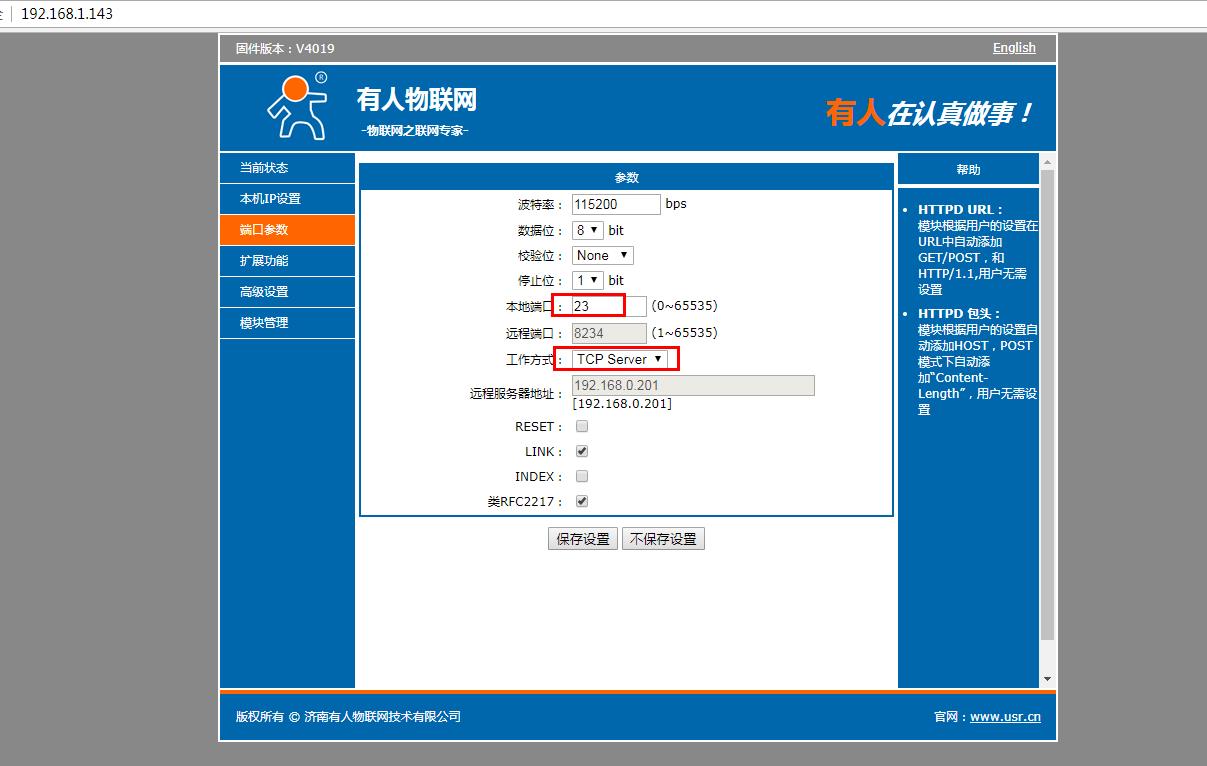 网页检查串口参数,工作方式设置TCP server,本地端口号默认是23,网页设置参数保存设置,需要重启304.