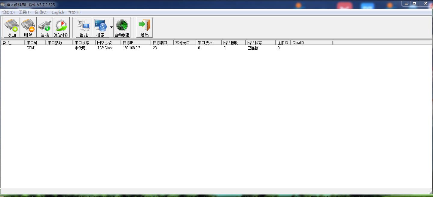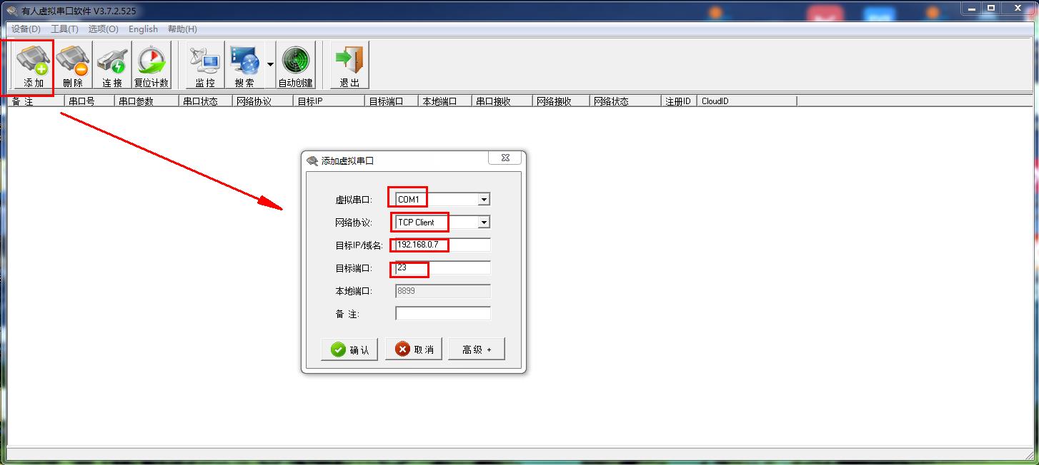 虚拟串口软件手动添加一个COM1,网络协议设置TCP client,目标IP填192.168.0.7,目标端口填23。