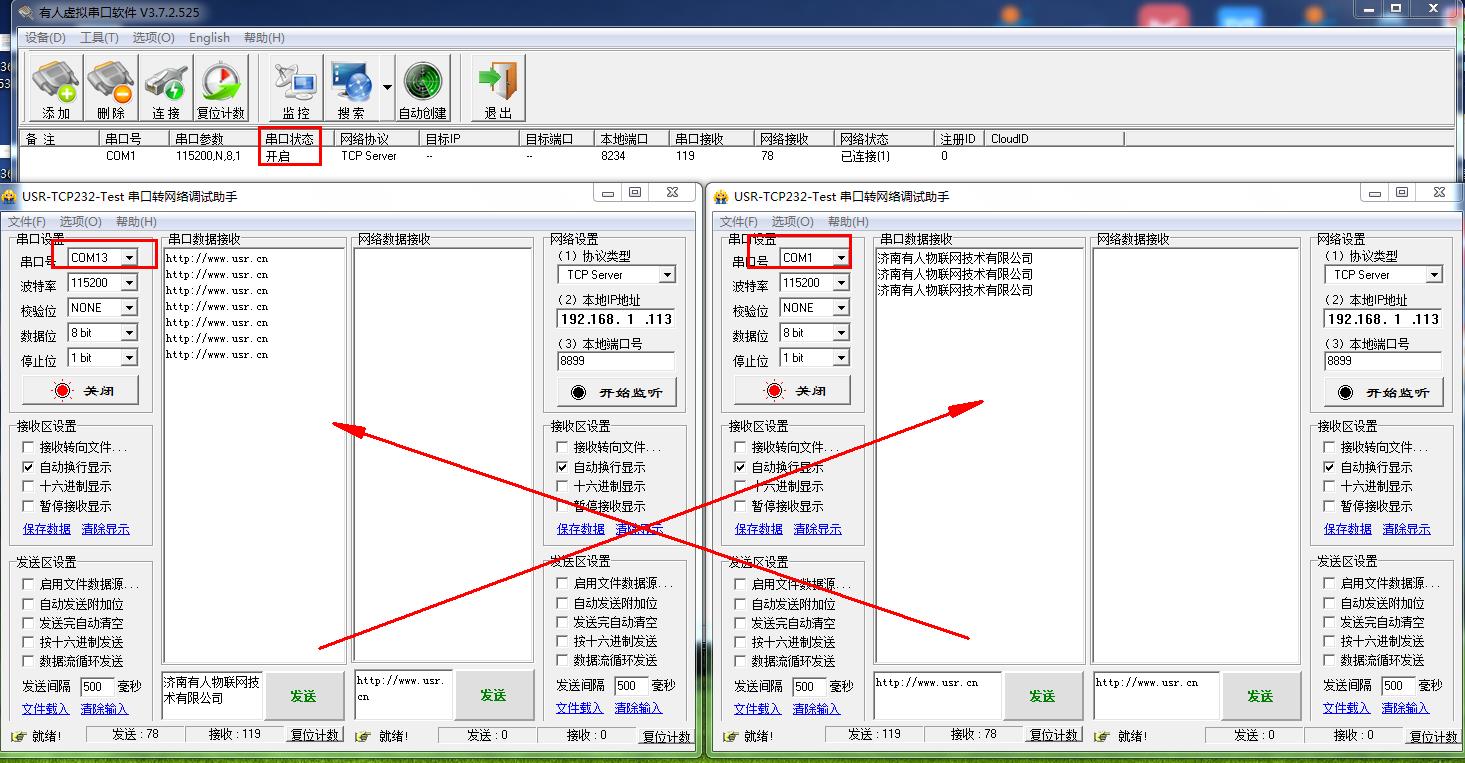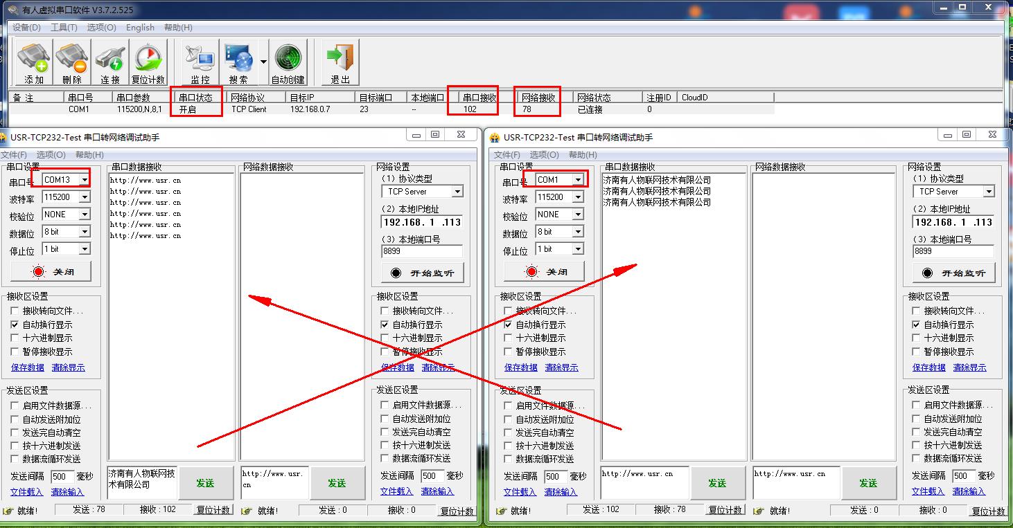 在电脑上,打开2个串口助手,USR-TCP232-TEST软件。