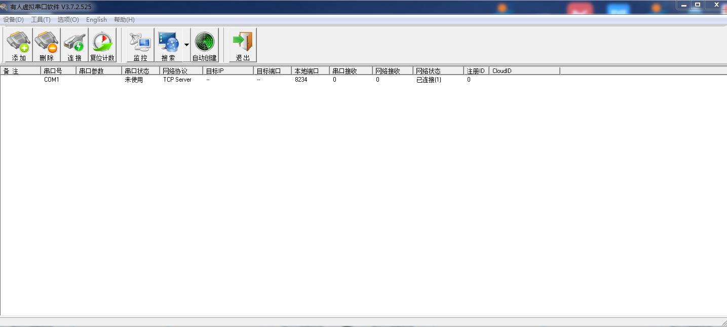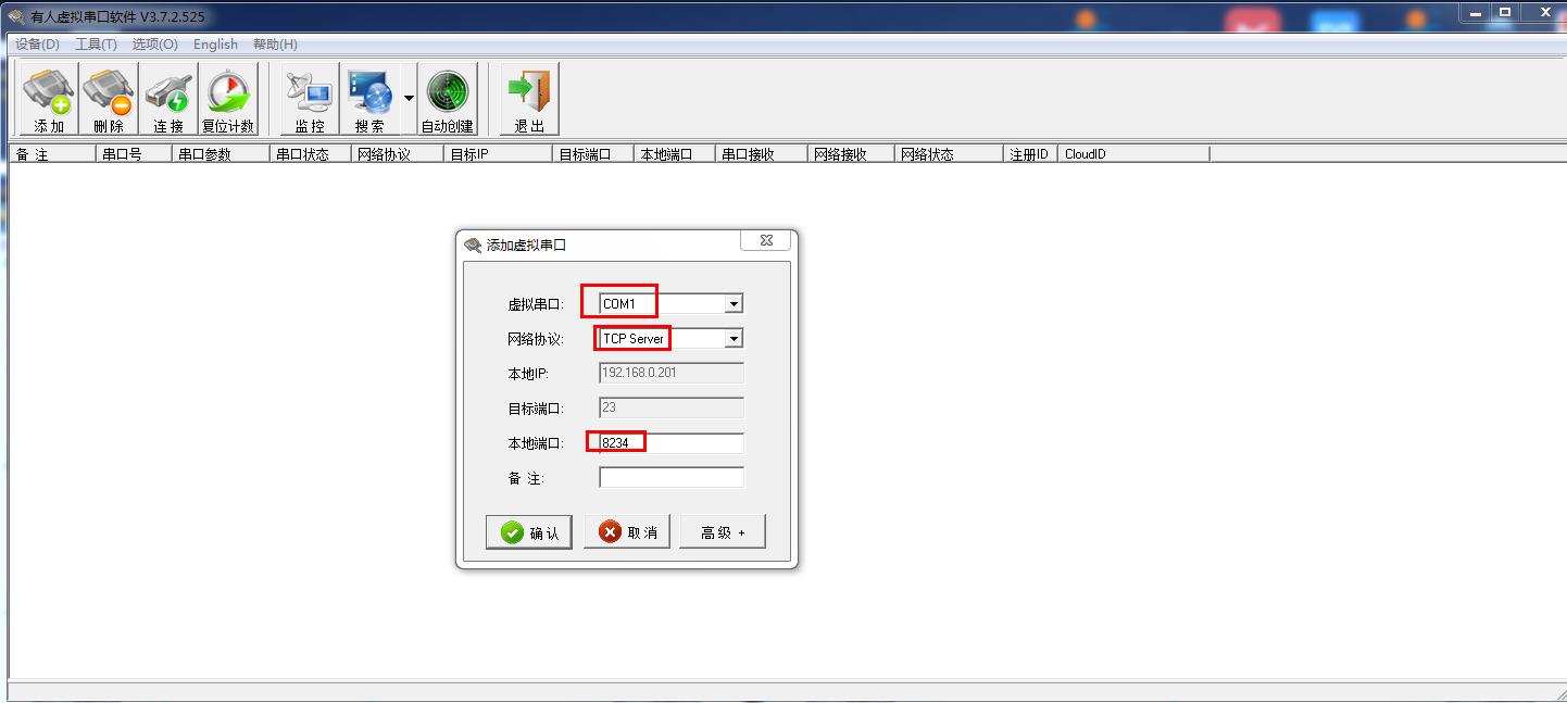 虚拟串口软件手动添加一个COM1,网络协议设置TCP server,本地端口填8234。