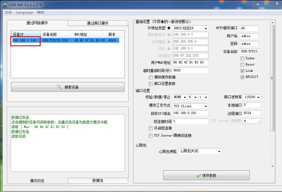 用M0设置软件搜索USR-TCP232-304的IP 192.168.1.143