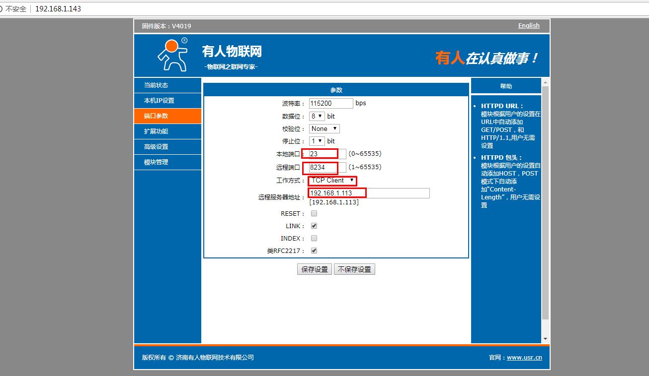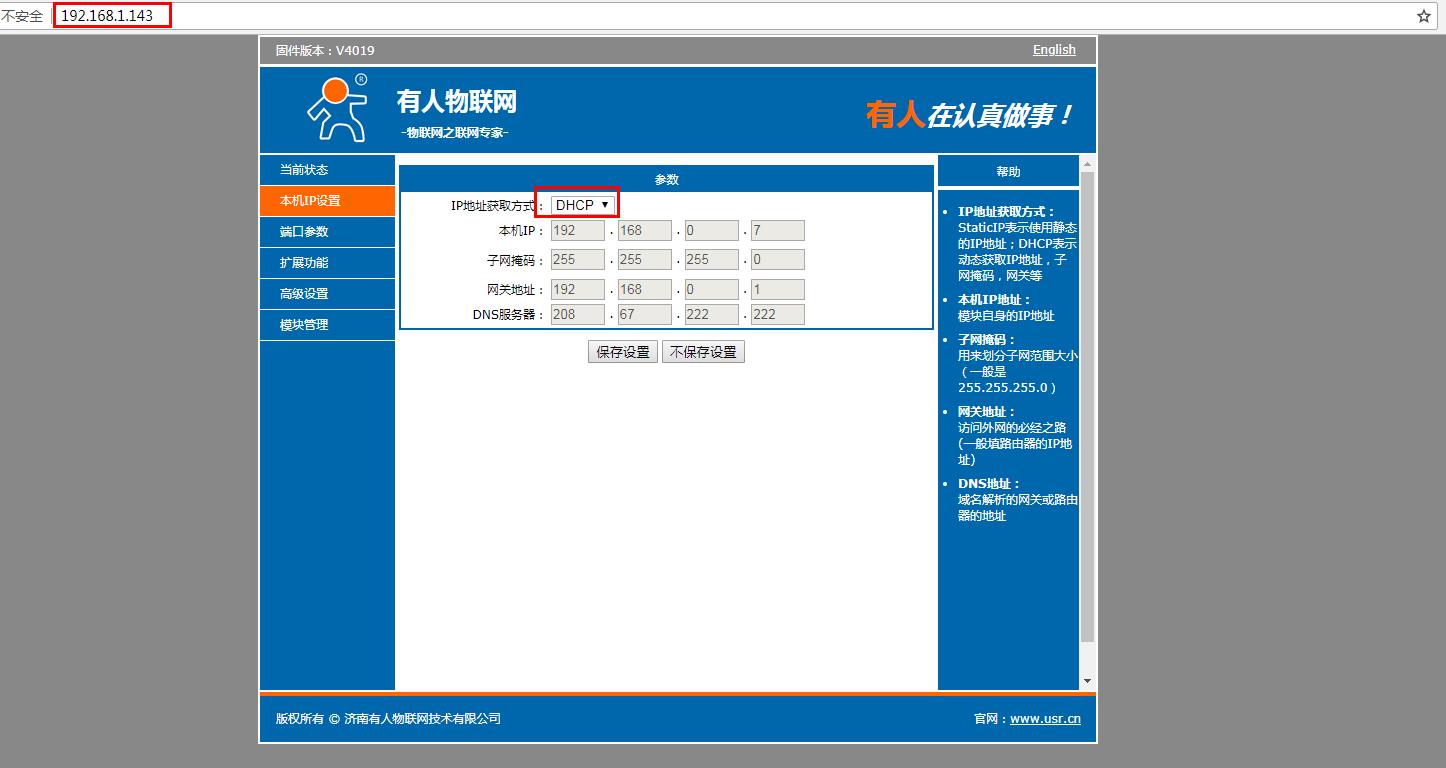 在电脑打开浏览器,输入静态IP192.168.1.143 登录USR-TCP232-304的内置网页。