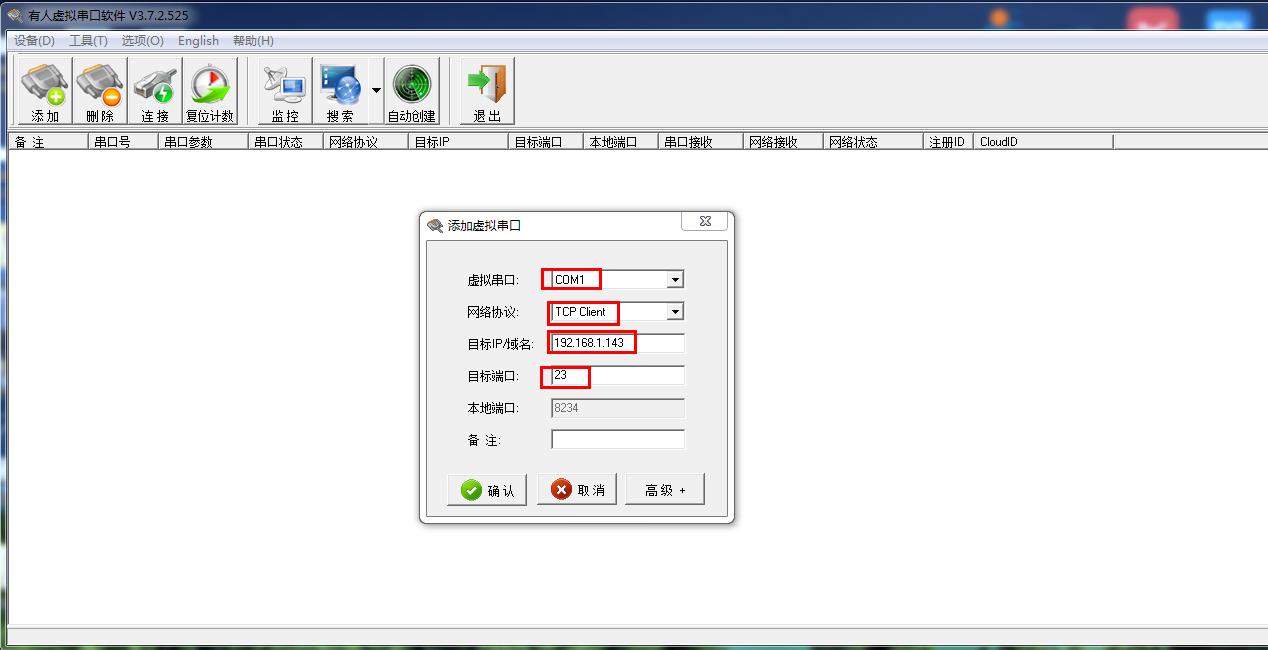 虚拟串口软件手动添加一个COM1,网络协议设置TCP client,目标IP填192.168.1.143,目标端口填23。