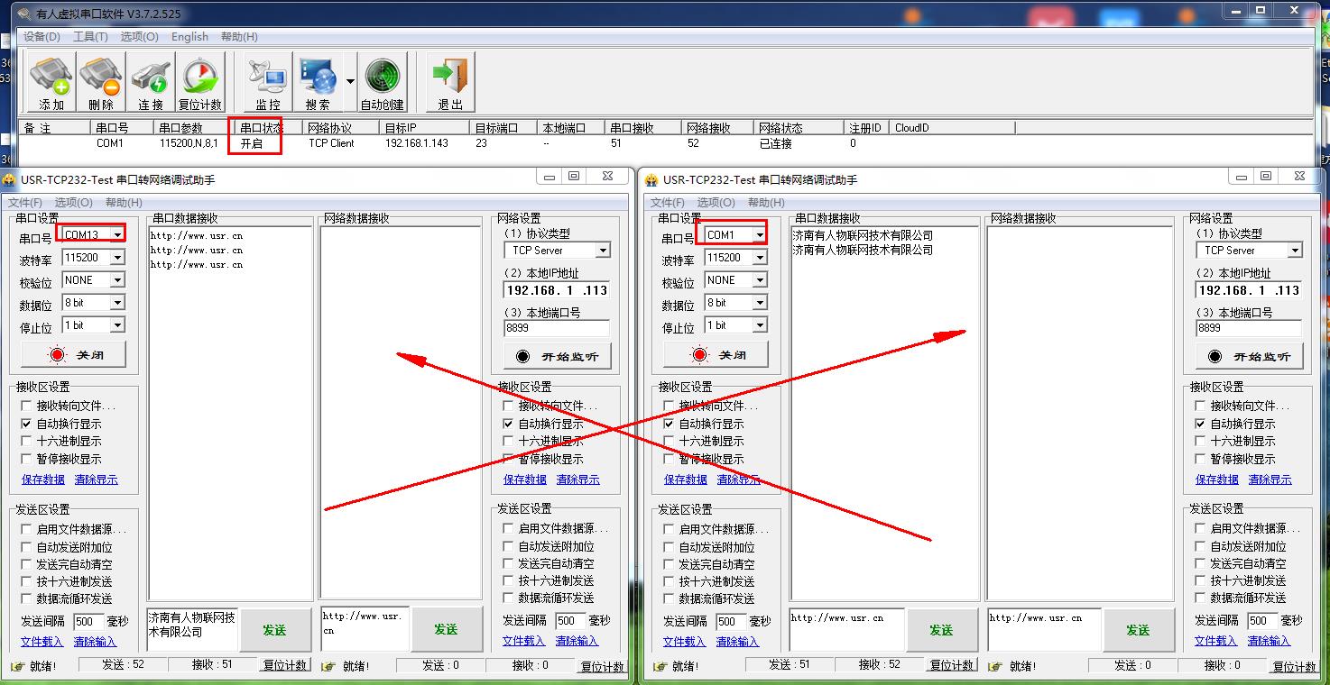 分别打开USR-TCP232-304实际串口COM13,虚拟串口COM1。
