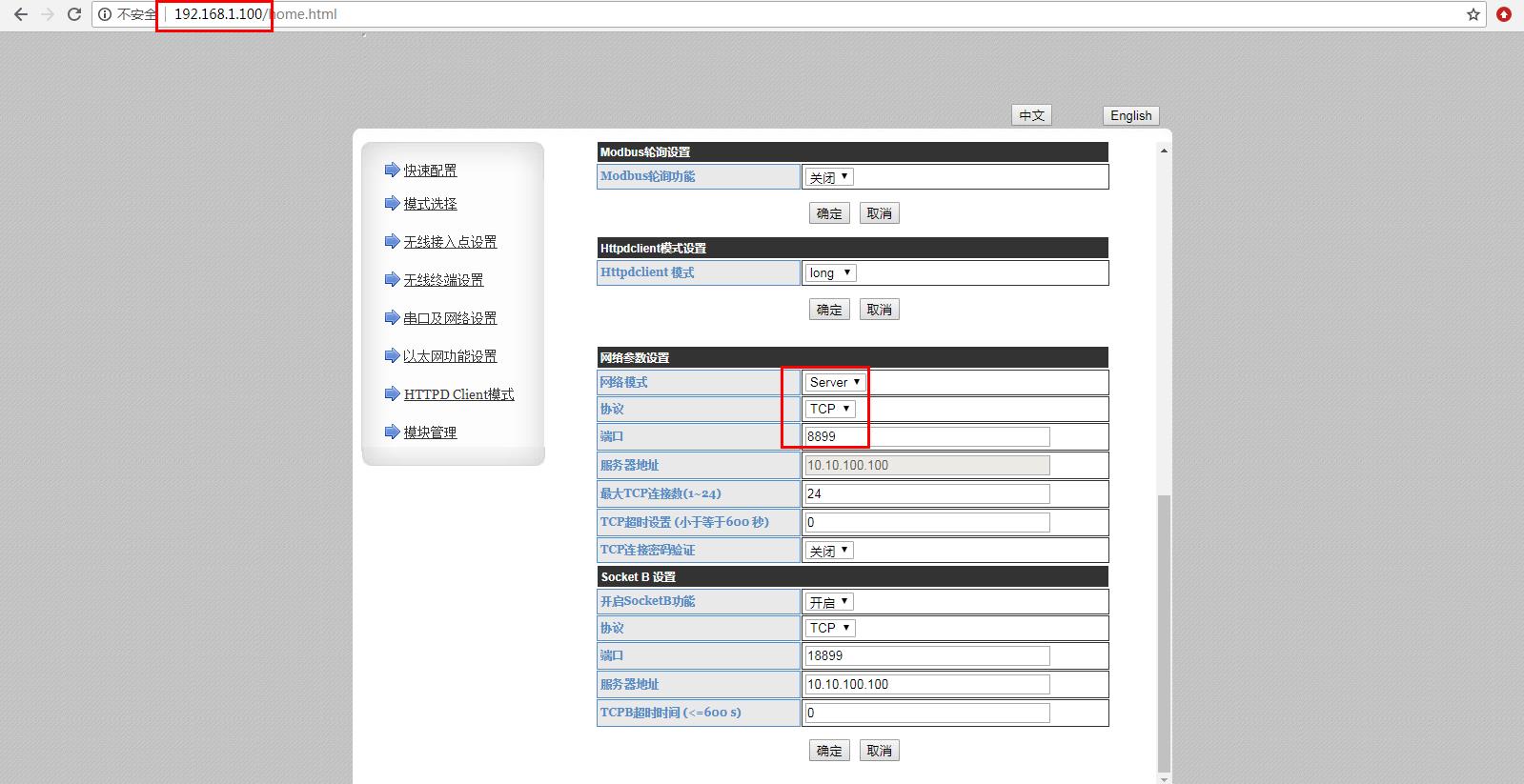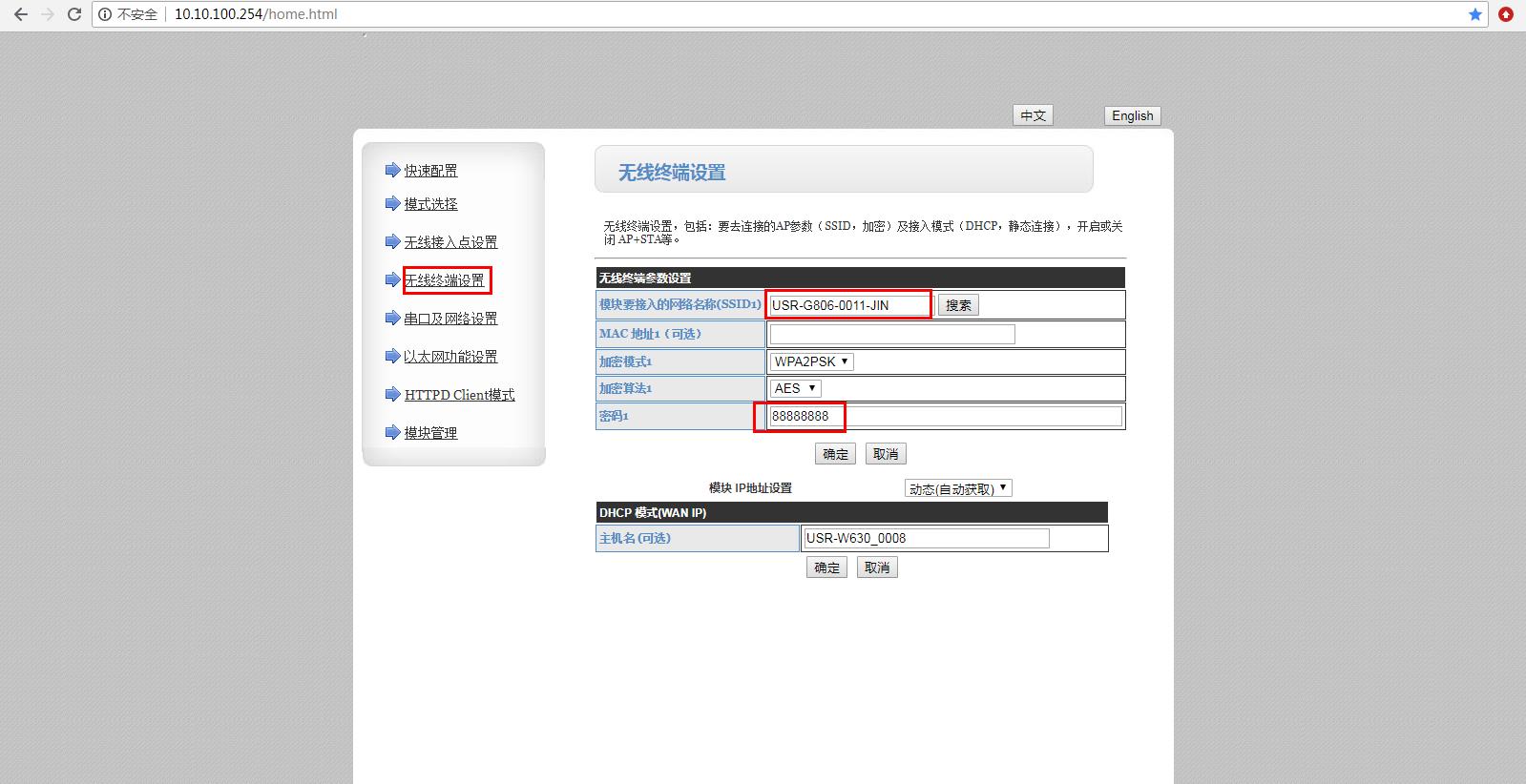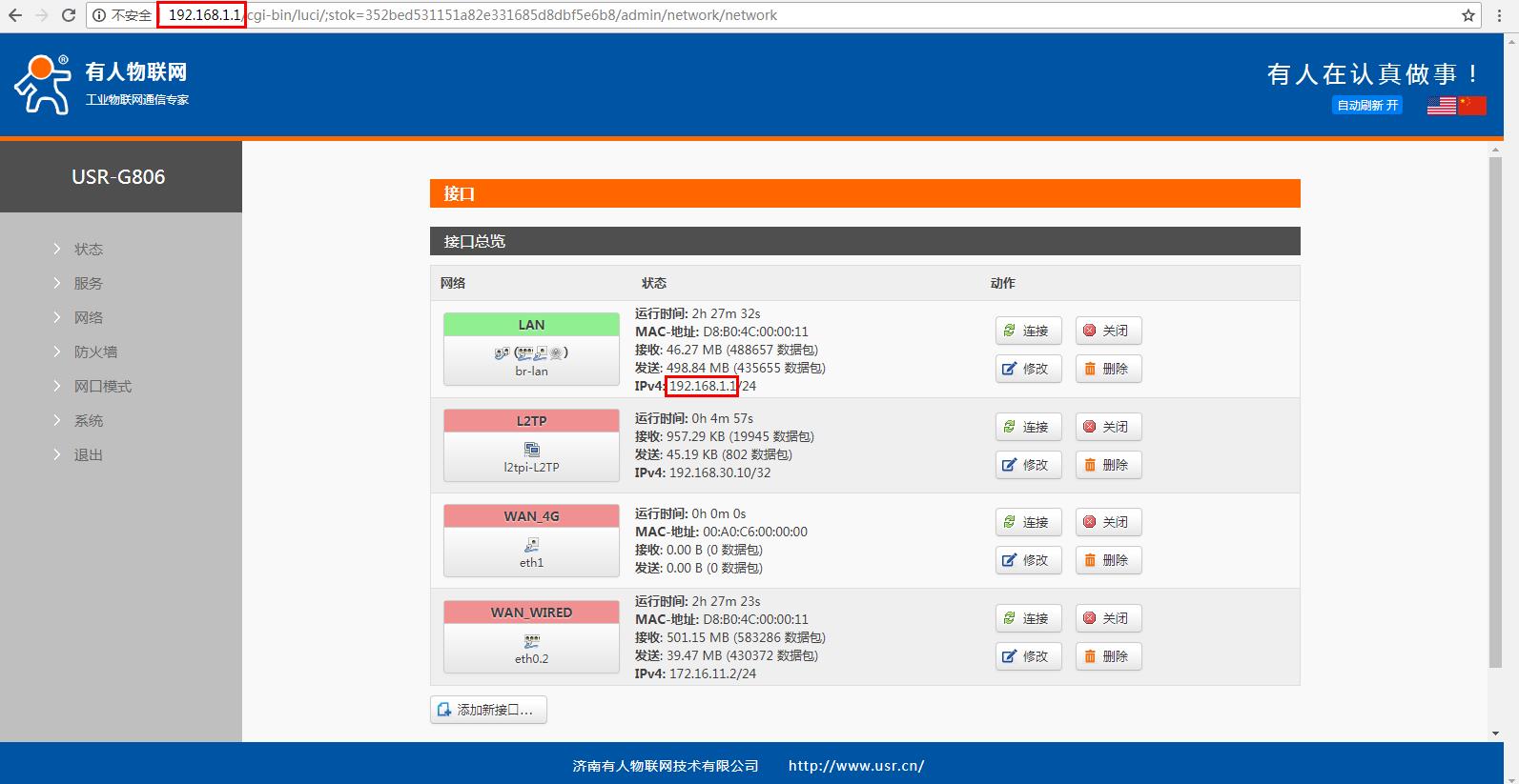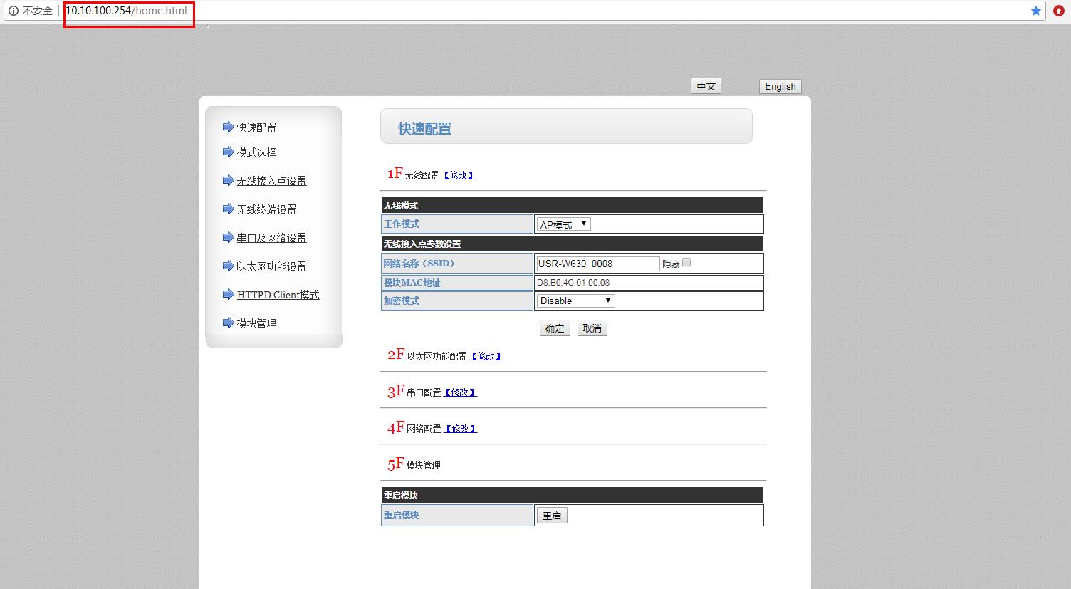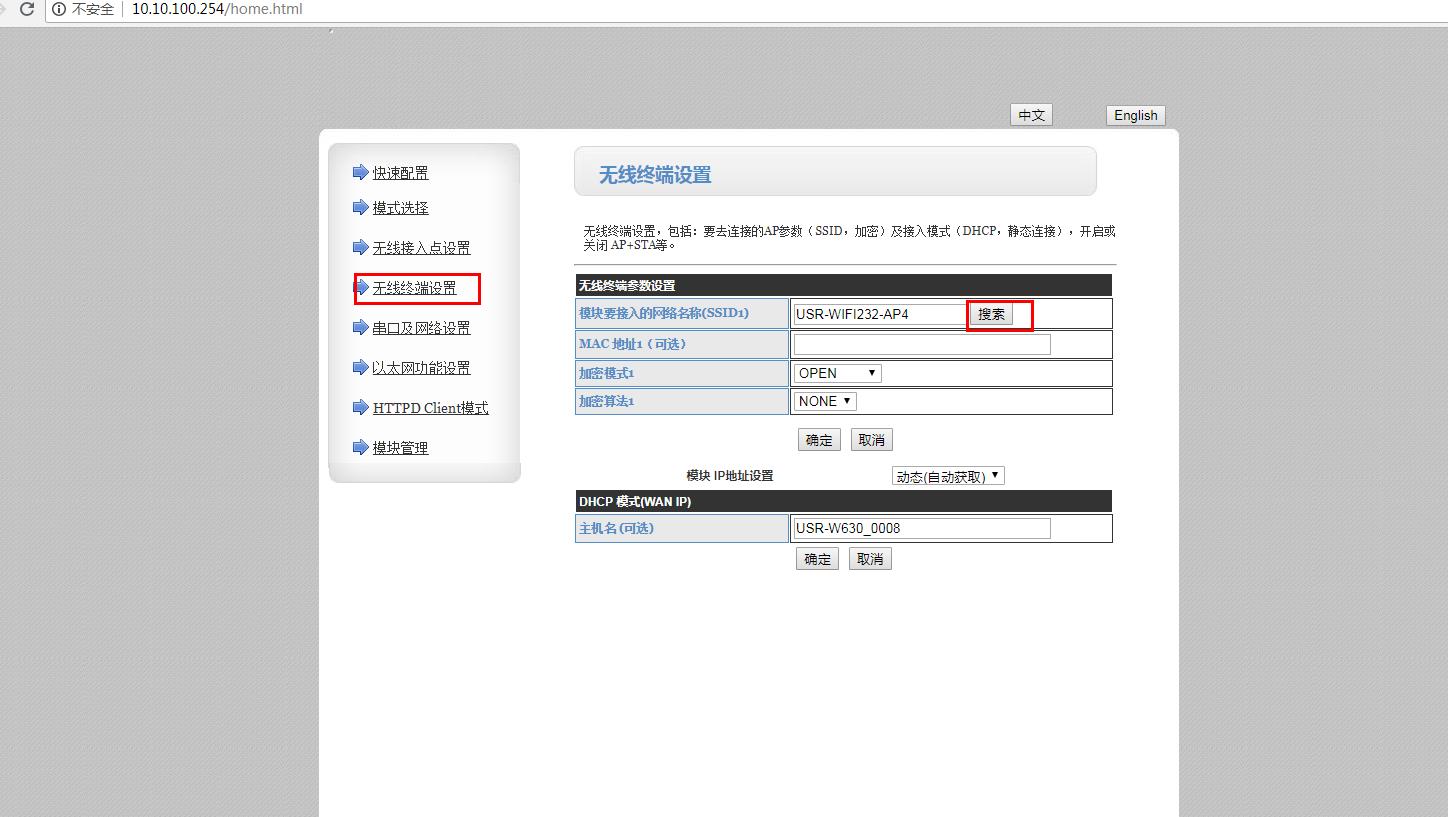 1、电脑连接路由器的wifi,电脑浏览器使用设置的IP 192.168.1.100,登录USR-W630的内置网页。