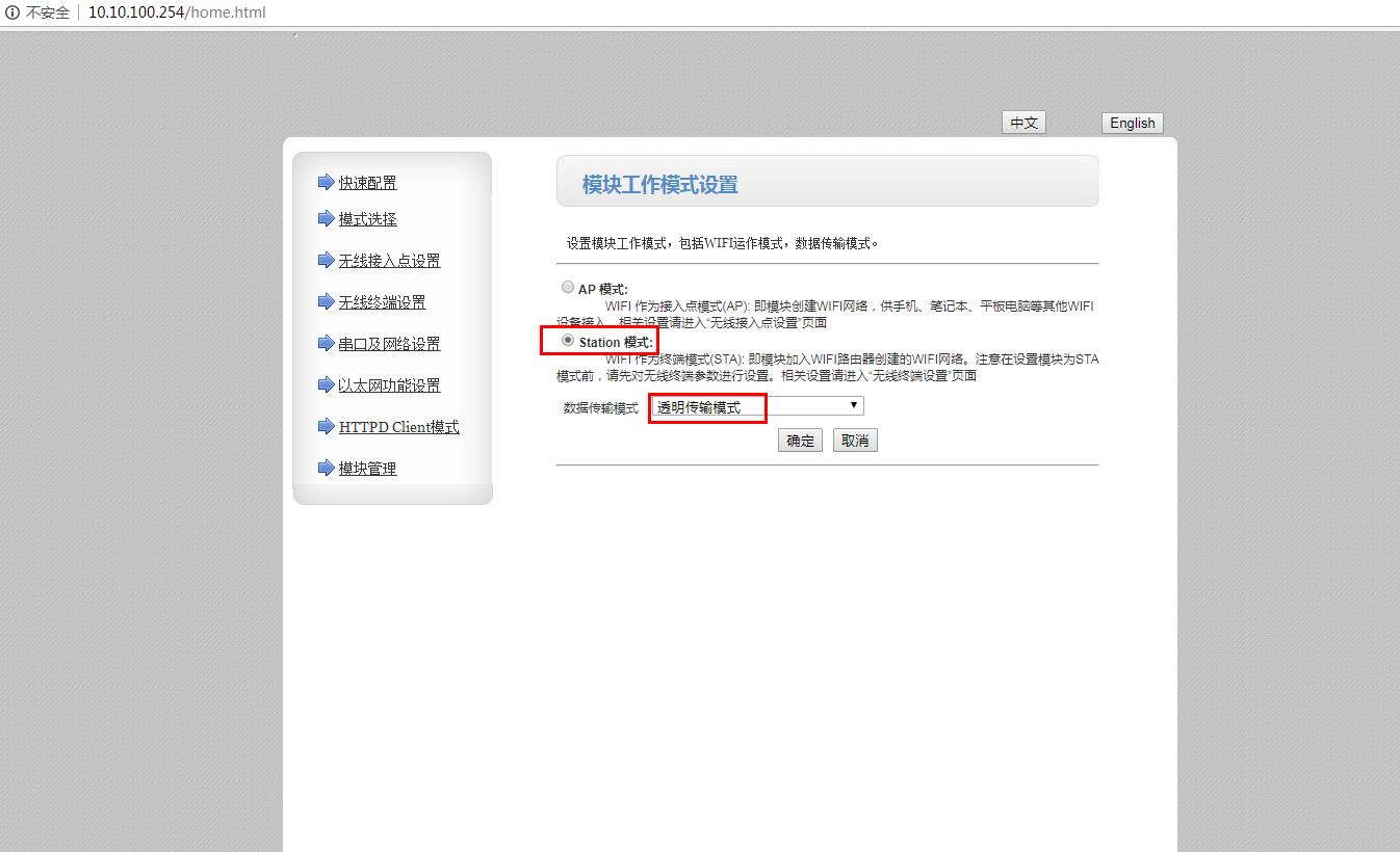 1、登录之后,在模式选择中,将USR-W630的工作模式从默认AP模式改为STA模式,点击确定,会跳出重启提示,建议不要立刻重启,需要所有网页参数设置完毕之后,最后再重启USR-W630。