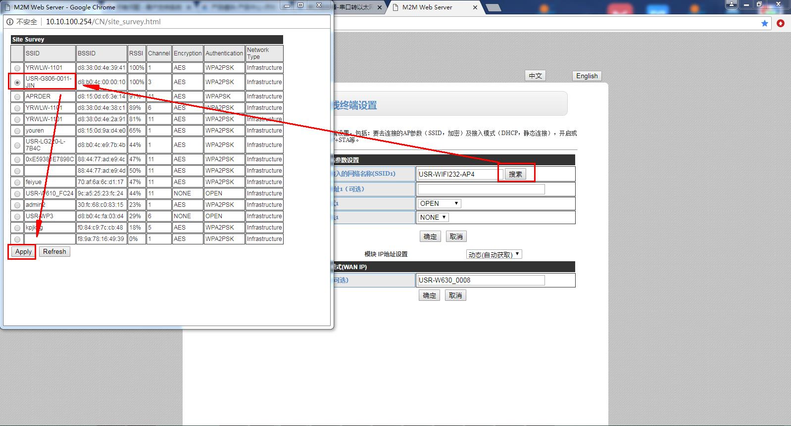 在无线终端设置中,点击模块要接入的网络名称SSID,可以手动输入USR-W630设置STA模式要连接路由器wifi的名称,或者点击后面的搜索,搜索路由器的wifi。勾选,并点击APPLY应用。跳出输入路由器wifi密码提示,输入路由器的wifi密码。点击确定。