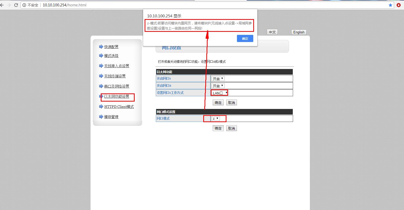 1、在以太网功能设置,网口工作模式是LAN口,网口模式设置Z。就是桥接模式。默认是n模式,需要改为z模式。点击确定。