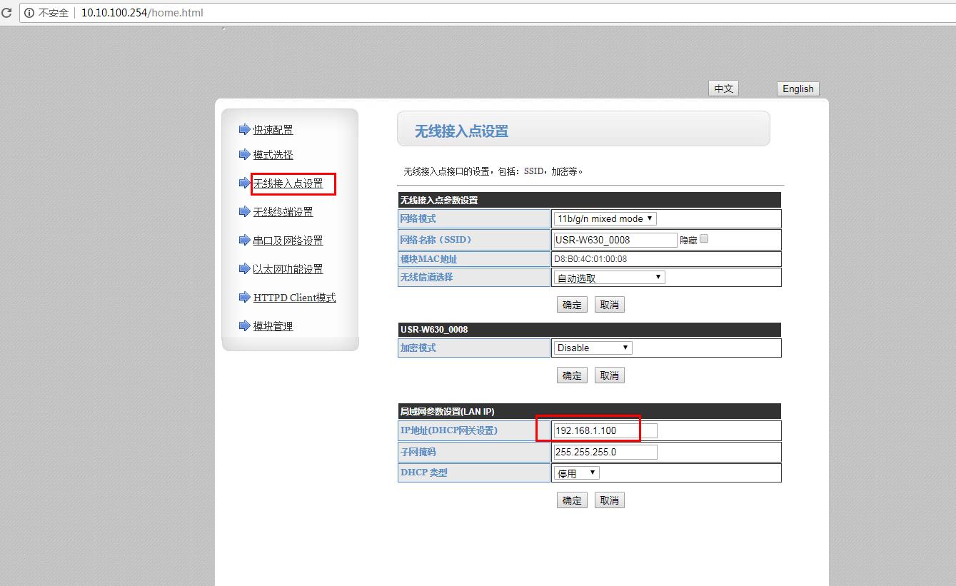 2、在无线接入点设置,局域网参数设置默认是10.10.10.254,需要修改为和USR-W630所连接路由器LAN IP同网端的IP。