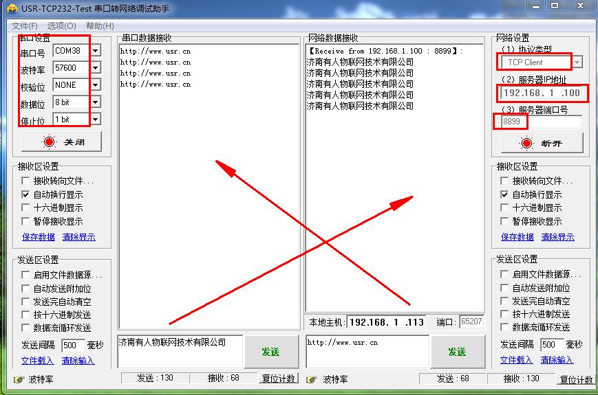 在电脑上用USR-TCP232-TEST软件测试,打开COM口,网络端设置参数。