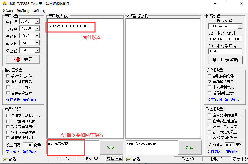 1、查询DR504的固版本:usr.cnAT+VER,发送时使用enter换行之后再发送。