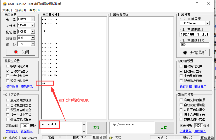 5、生效之后,DTU会重启,此时,将串口助手串口波特率修改为9600,然后重新打开串口,我们任意发送指令与DTU通信,可以进行正常通信。