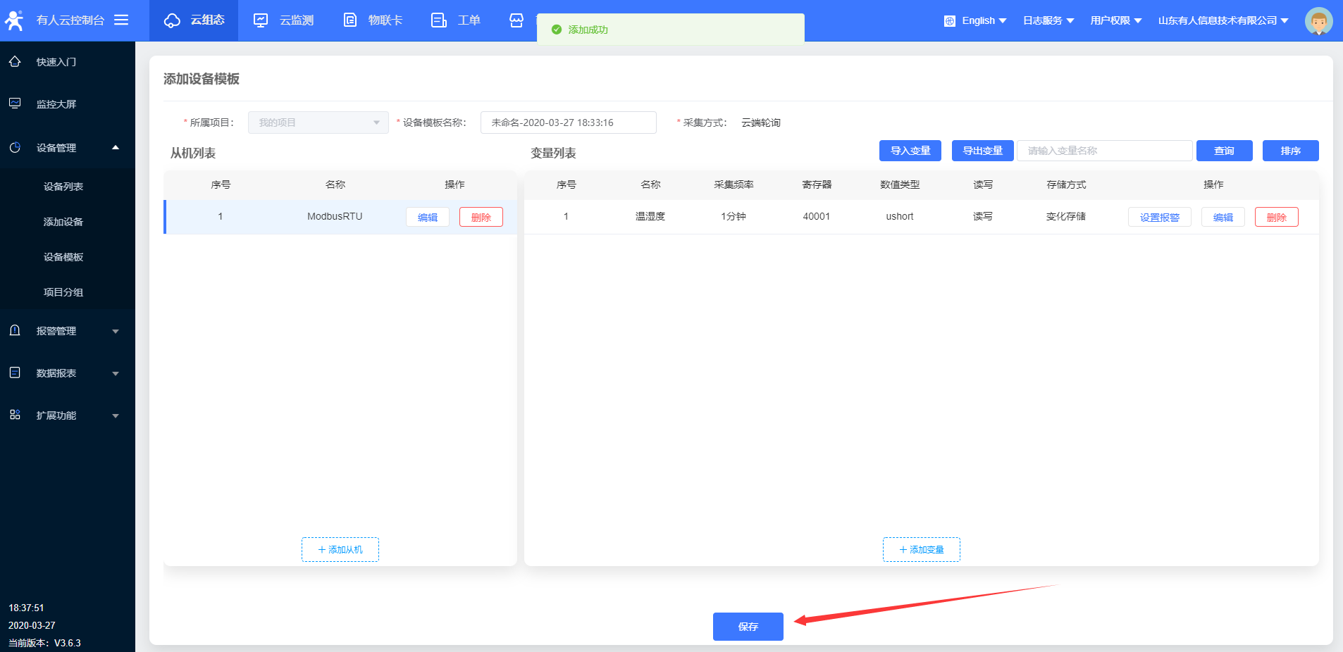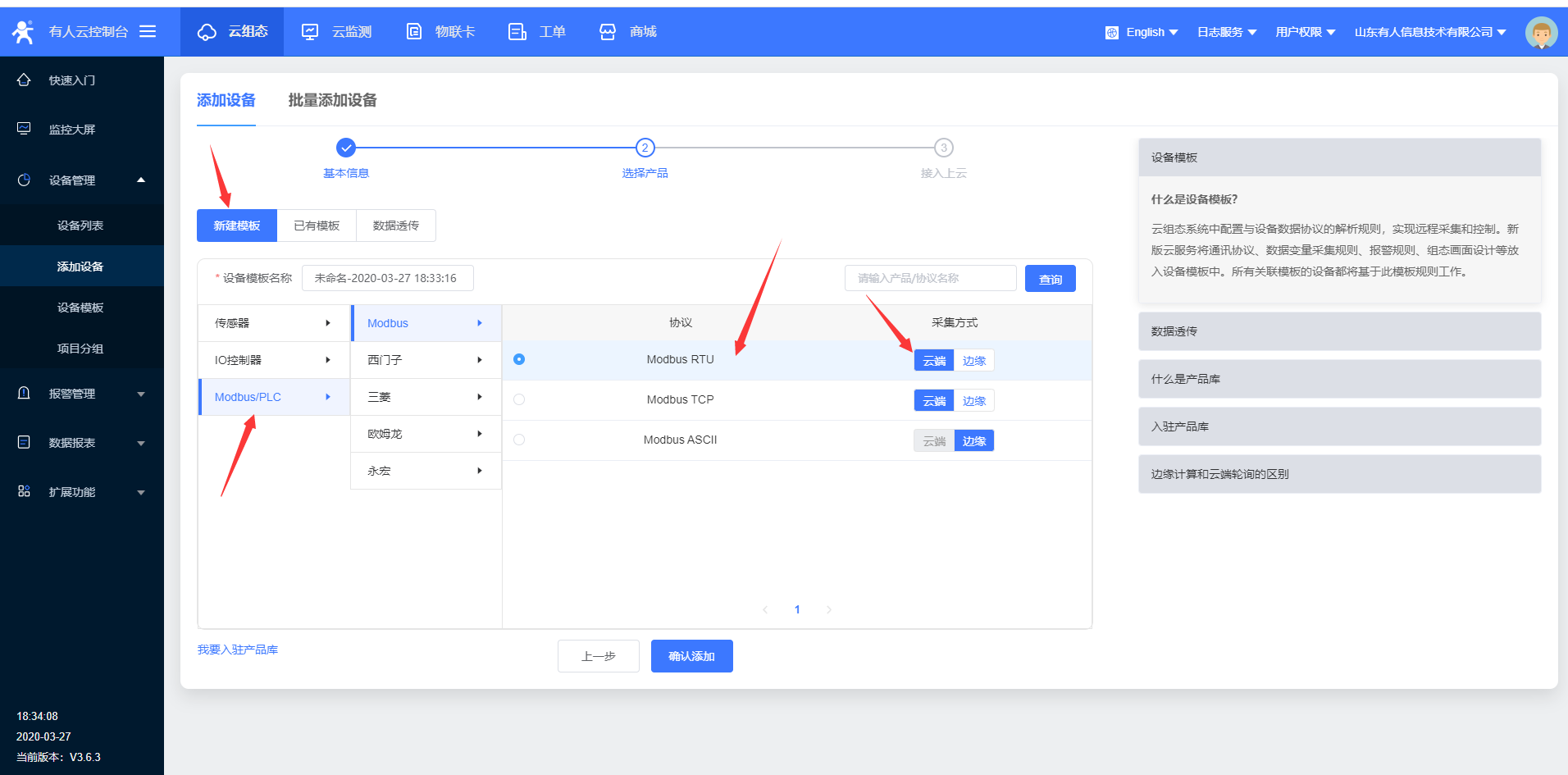 4.进入云组态,选择添加设备,W600目前只能使用ID方式添加设备id;设备id和密码设置默认就可以,点击下一步,添加数据模,模板更改名称,选择modbus rtu云端采集,确认添加。