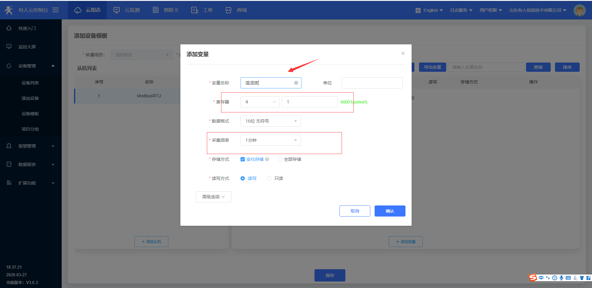 设置数据变量名,寄存器地址,数据格式,采集频率(最低只能是一分钟,);