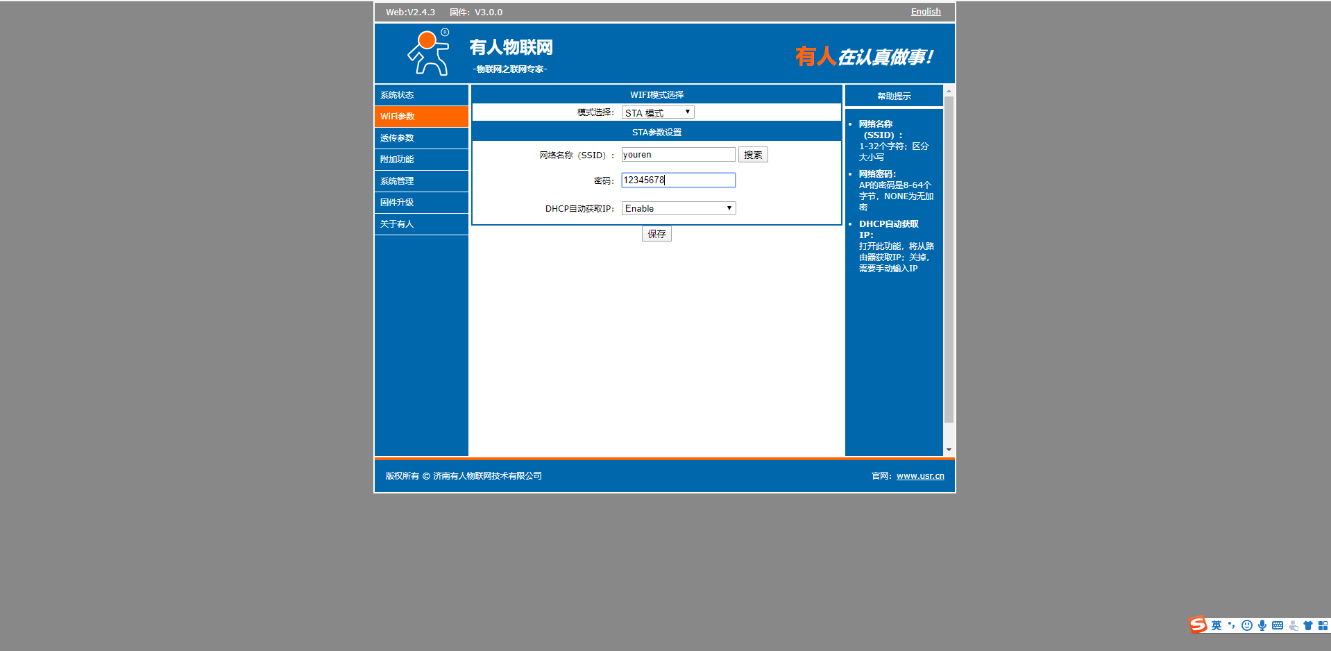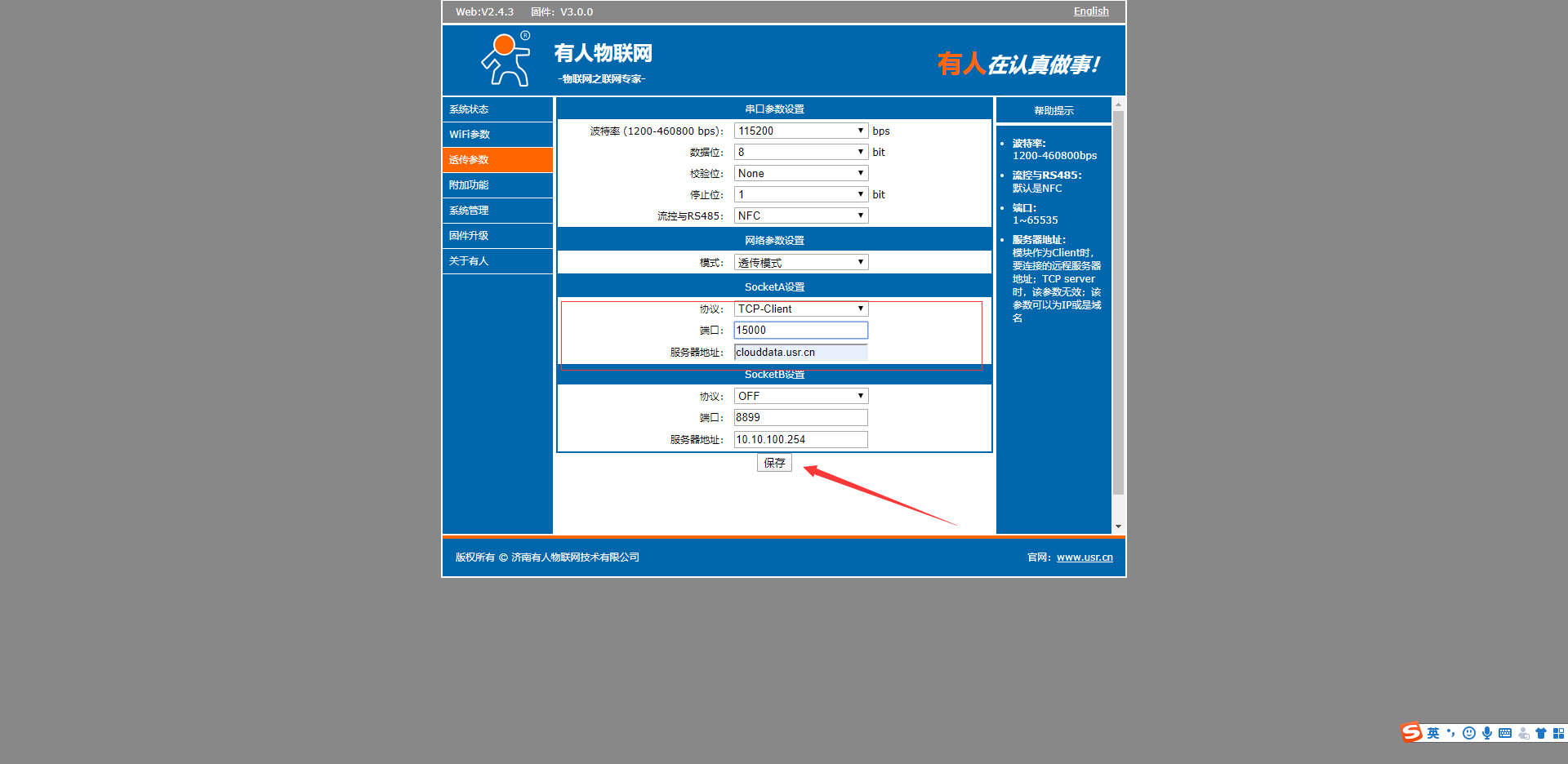 8.在透传参数,设置串口参数设置为和您终端设备的串口参数一致。做tcp client,远程服务器为clouddata.usr.cn,远程端口15000,,点击保存