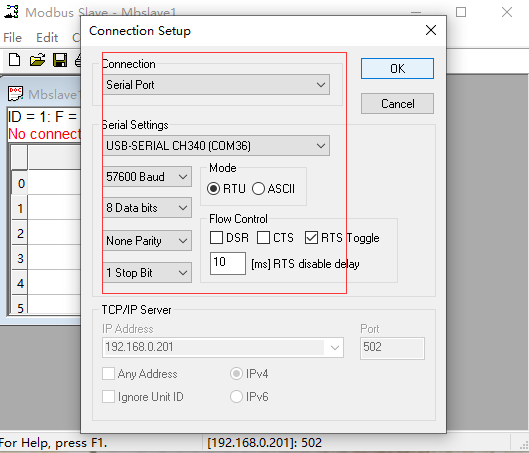 11、打开modbus软件,点击连接。选择串口com36(w630的串口用usb转485接到电脑上的),串口参数要和w600一致。