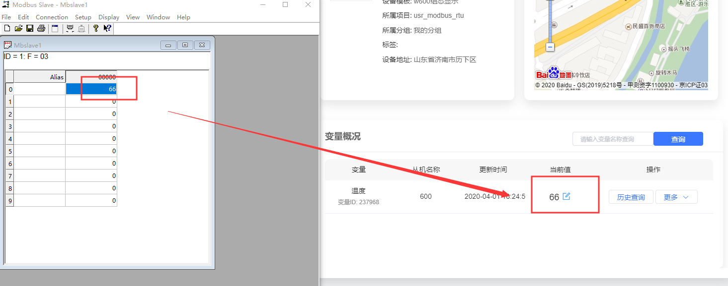 12、在modbus slave串口软件发送数值,可以在有人云上进行数据的显示,其中ID1是从机号,03是功能码