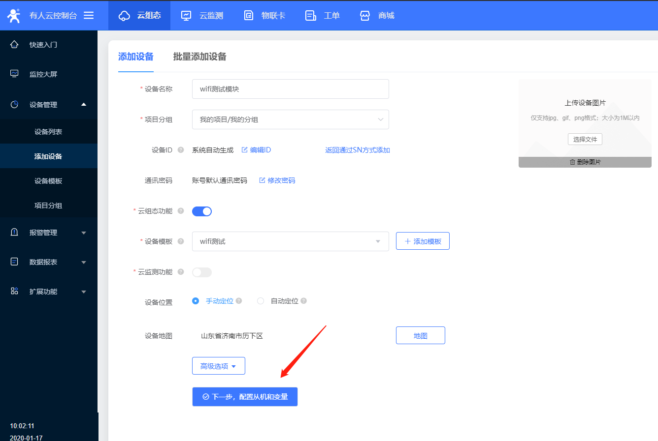 5、本次案例是C215连有人云进行数据显示,可以进入云组态,选择添加设备。