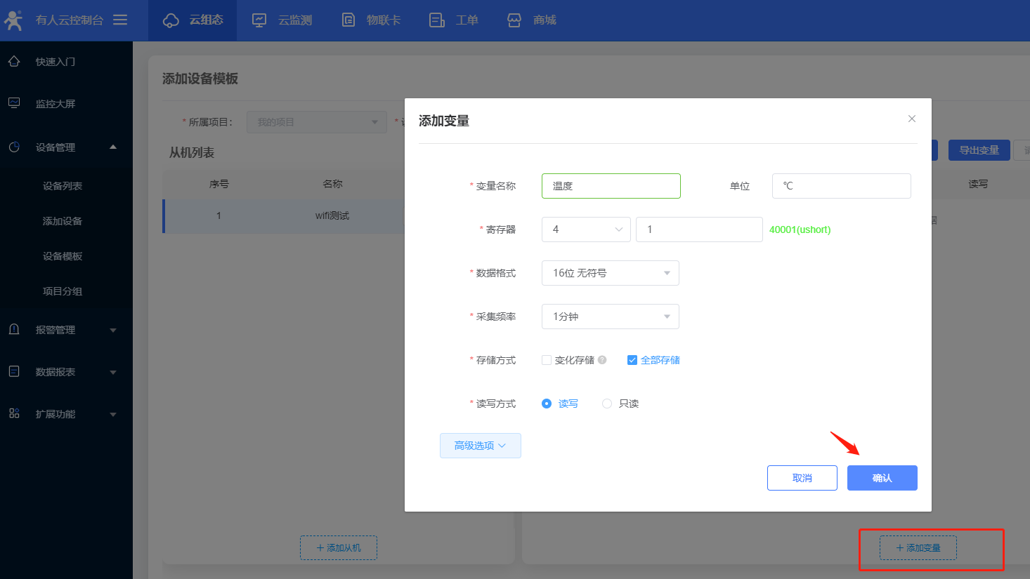 7、模板更改名称,选择“Modbus” - “ModbusRTU” - “云端采集”,点击“确认添加”。