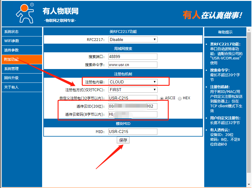 14、进入附加功能,注册包选择透传云,填上透传云上新建立的设备id,和密码(如下图所示),点击保存