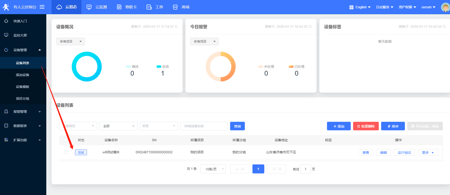 15、设置完所有的参数要重启设备,稍等一会,在有人云界面,您会看到设备已经上线