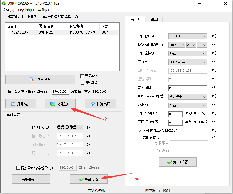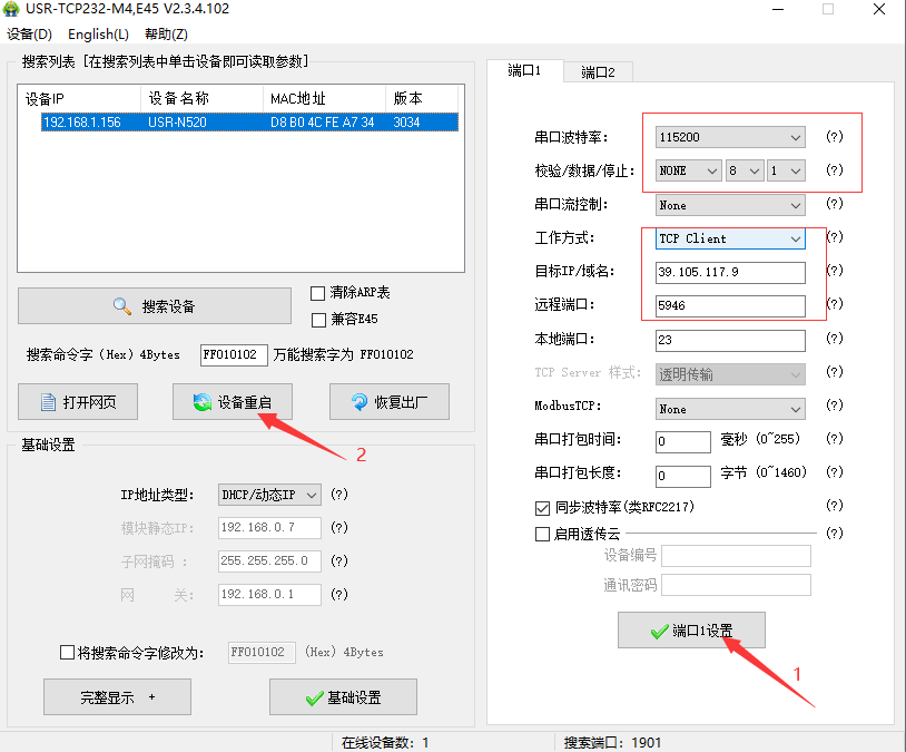4.修改服务器地址和端口--->端口1设置--->设备重启。这里填写的为我自己服务器的ip,端口为临时创建的端口,用户在使用时不可以依照次ip与端口来进行配置,需要连接自己服务器的ip与端口。