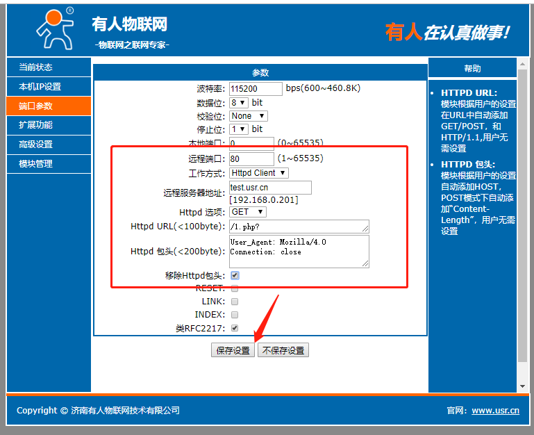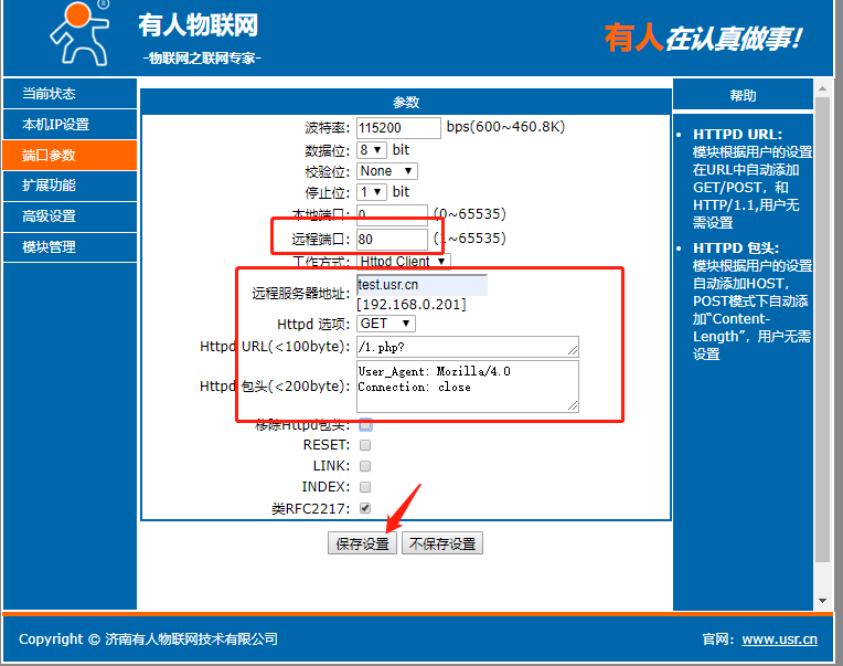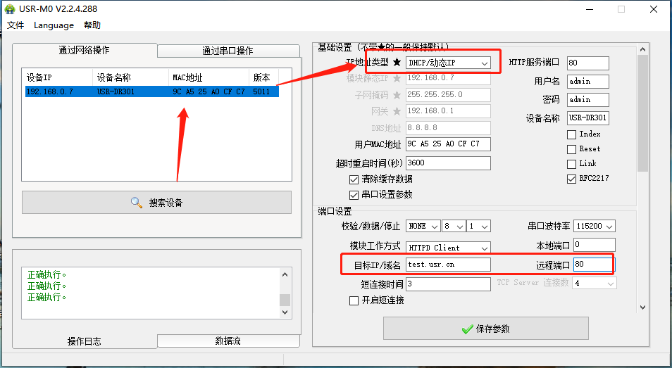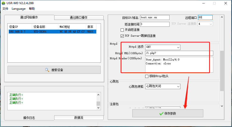 点击“搜索设备”当搜索列表中出现301的设备后,单击搜索到的设备,IP设置为DHCP,模块设置为Httpd Client模式,请求方式GET,URL为/1.php?,设置服务器地址test.usr.cn,端口80,设置并保存所有参数,重启模块。(本说明文档使用为有人测试服务器)