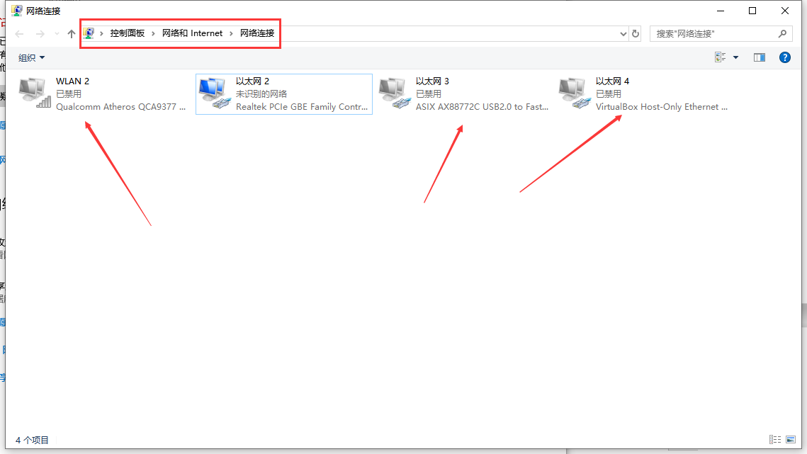 2、按路径:控制面板--->网络和Internet--->网络和共享中心找到“windows防火墙”和“更改适配器设置”选项,关闭防火墙并禁用与本次测试无关的网卡。并关闭电脑杀毒软件。