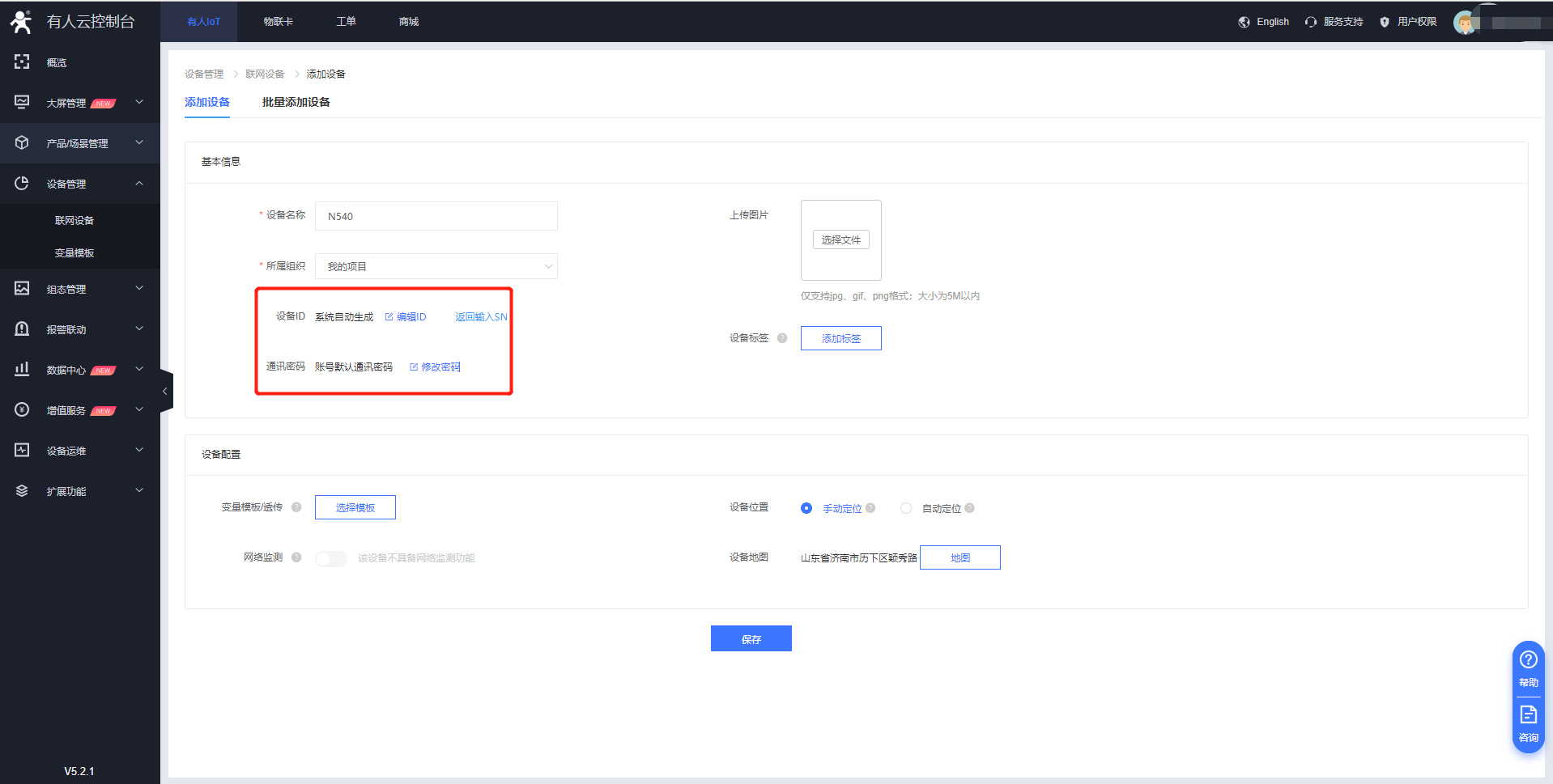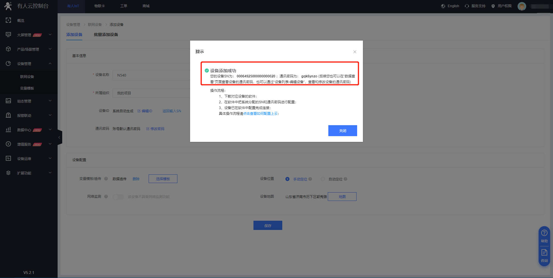 5、可以在这里看到默认生成的设备编号和通信密码,点击完成,云端成功添加设备