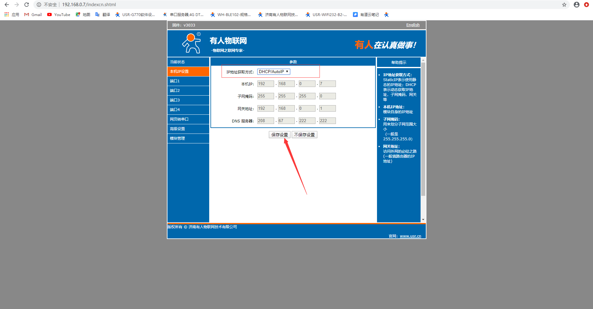 11、工作方式选择TCP Client,远程服务器地址:clouddata.usr.cn,远程端口:15000,本地端口不要设置为0,默认即可。注册包类型选择透传云,设备编号和密码填写为在云端添加设备生成的设备编号和密码(图片中的为测试生成的,请填写自己的设备编号和密码),点击保存设置,保存设置好的参数。