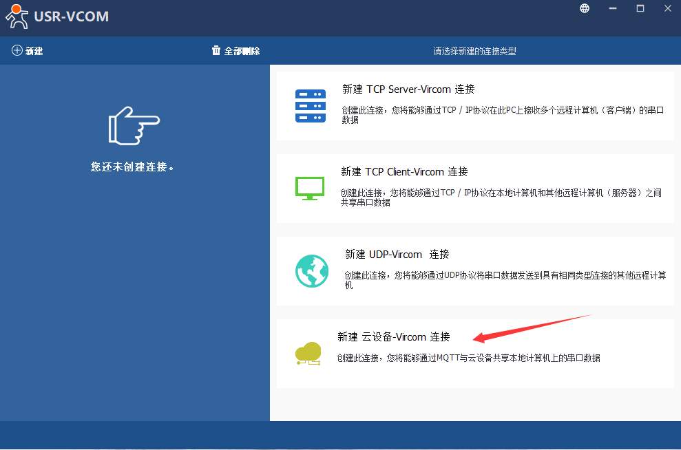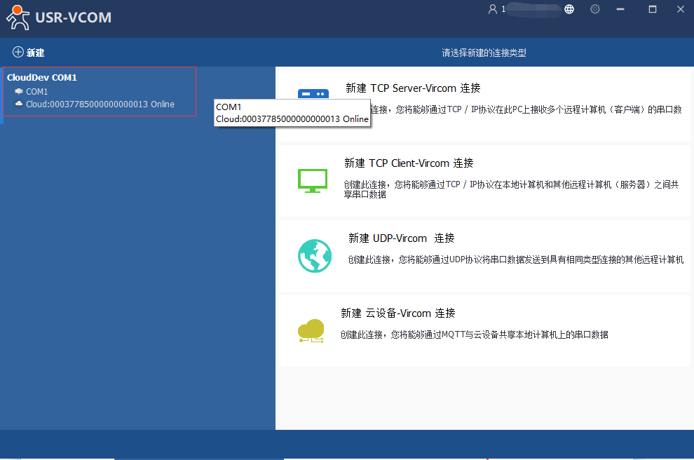 14、打开VCOM虚拟串口软件,点击新建云设备-Vircom连接
