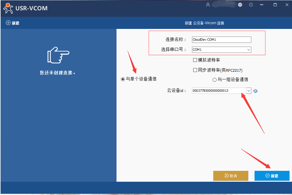 16、选择com口,不要和电脑上已存在的com口冲突,选择与单个设备通信,云设备ID选择在云端添加的其中一个N540的设备编号,点击新建,生成串口