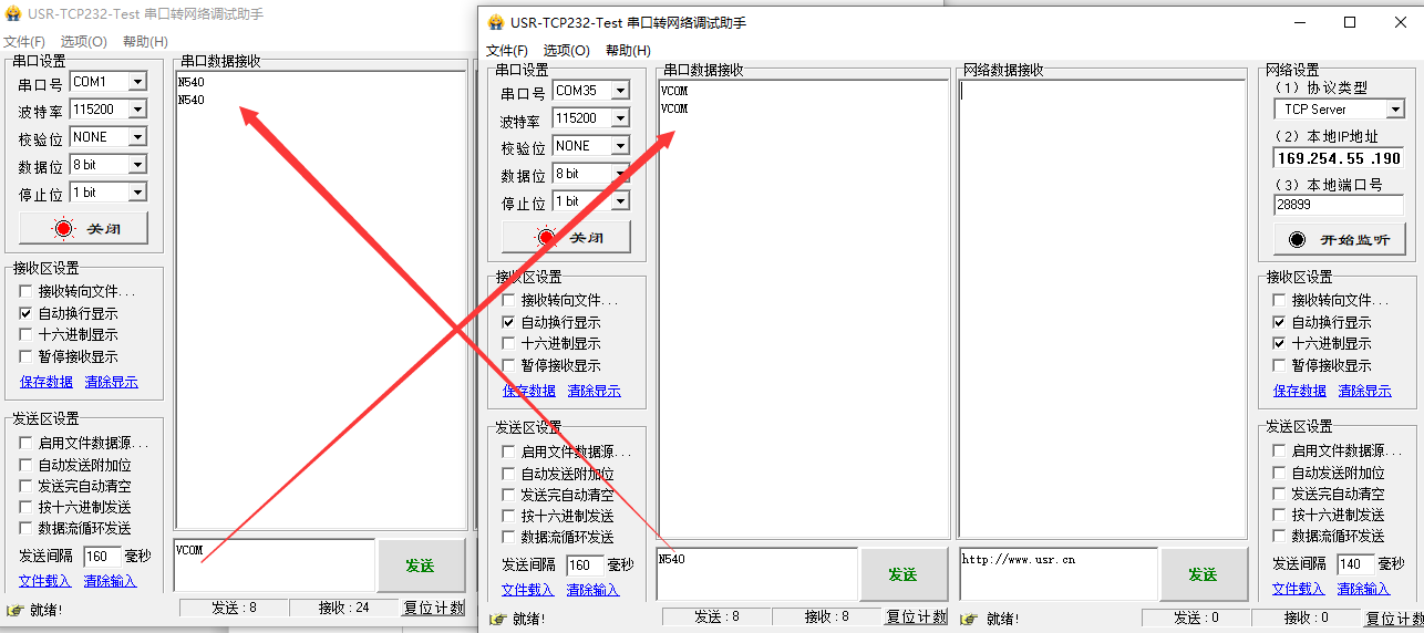 17、用串口调试助手打开N540的串口和VCOM生成的串口,进行数据收发测试