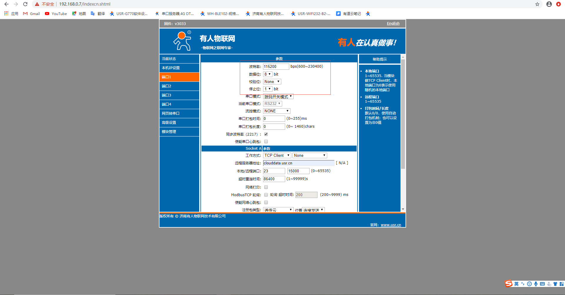 6.工作方式选择TCp Client,远程服务器地址:clouddata.usr.cn,远程端口:15000,本地端口不要设置为0,默认即可
