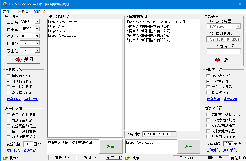 网络助手点击连接,有连接对象之后,测试串口和网络之间的数据传输。