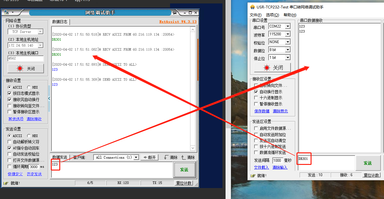 5、打开串口调试助手,填写串口参数和DR301的串口参数并保持一致,打开串口,即可和服务器建立通信。