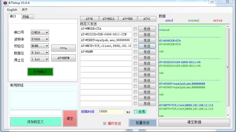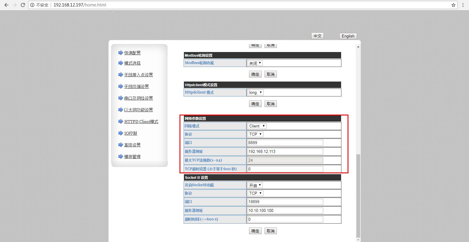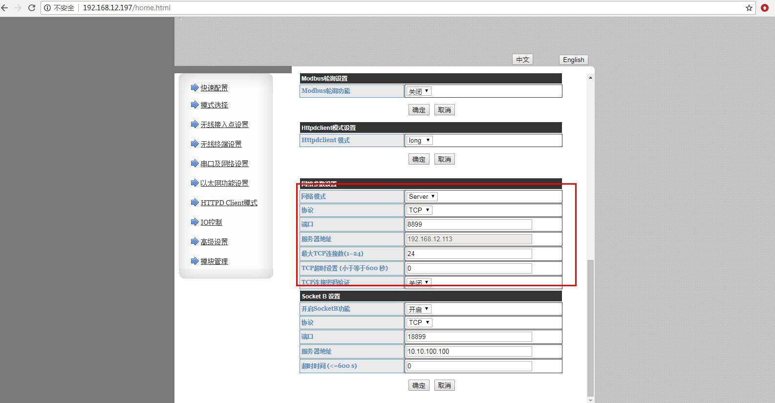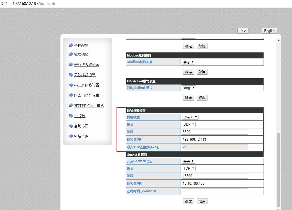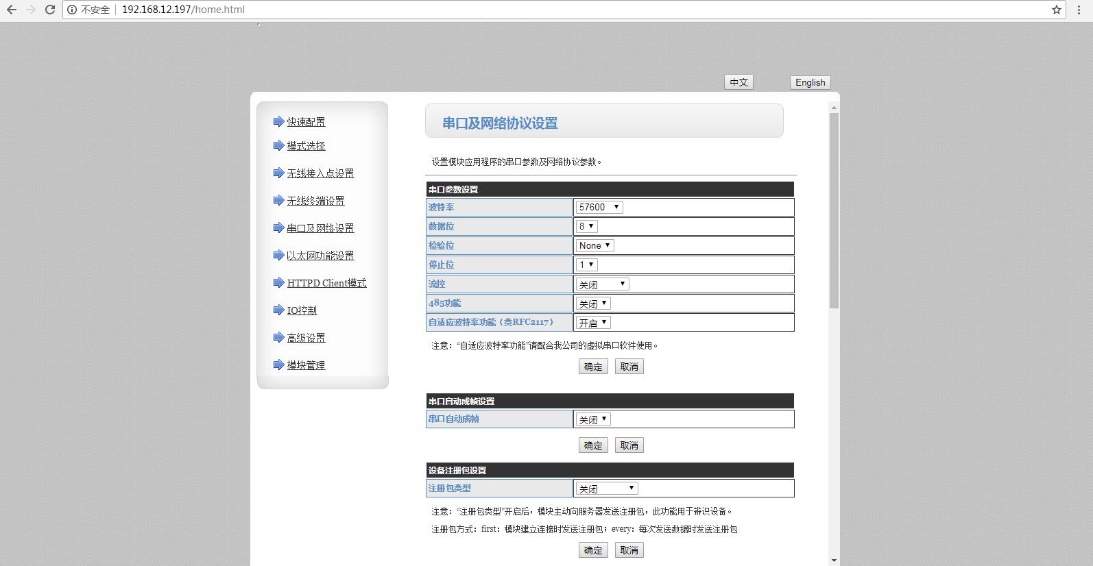 用USR-WIFI232-B2的Ip 登录USR-WIFI232-B2的网页,然后修改B2的串口参数。测试4种工作模式下,串口和网络的数据透传。
