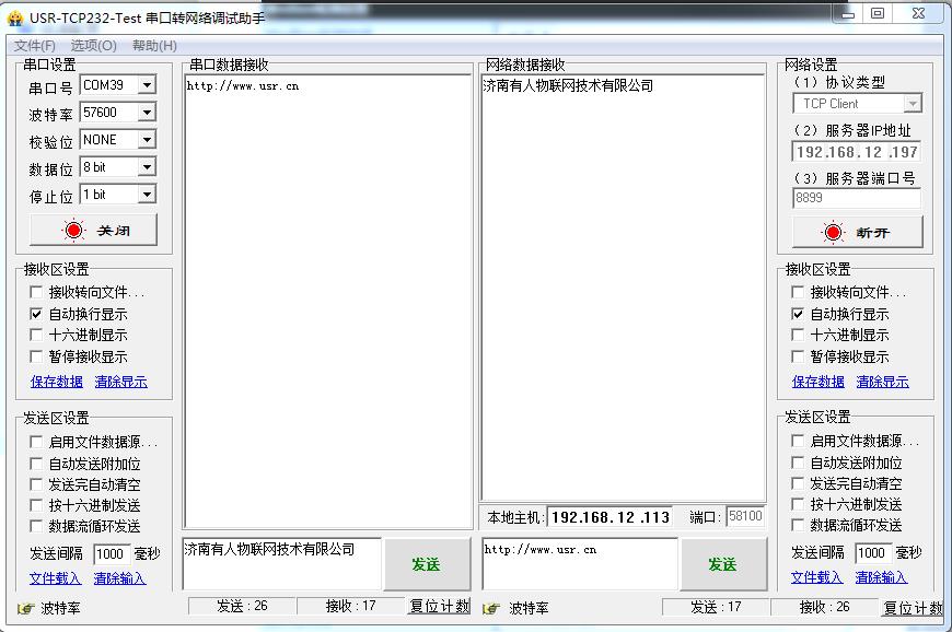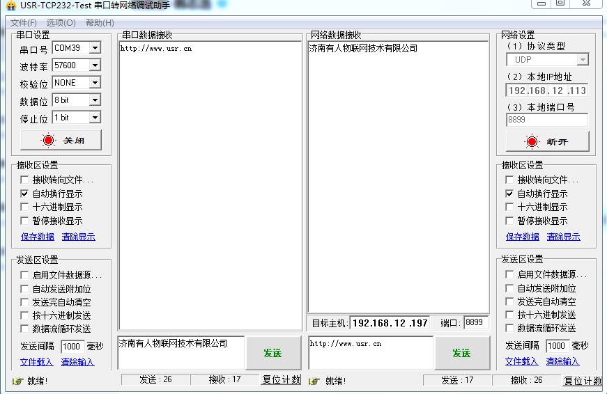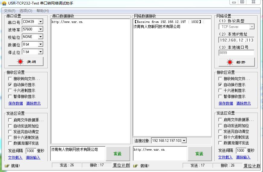 在电脑上用USR-TCp232-TEST软件测试,打开COM口,网络端设置参数。