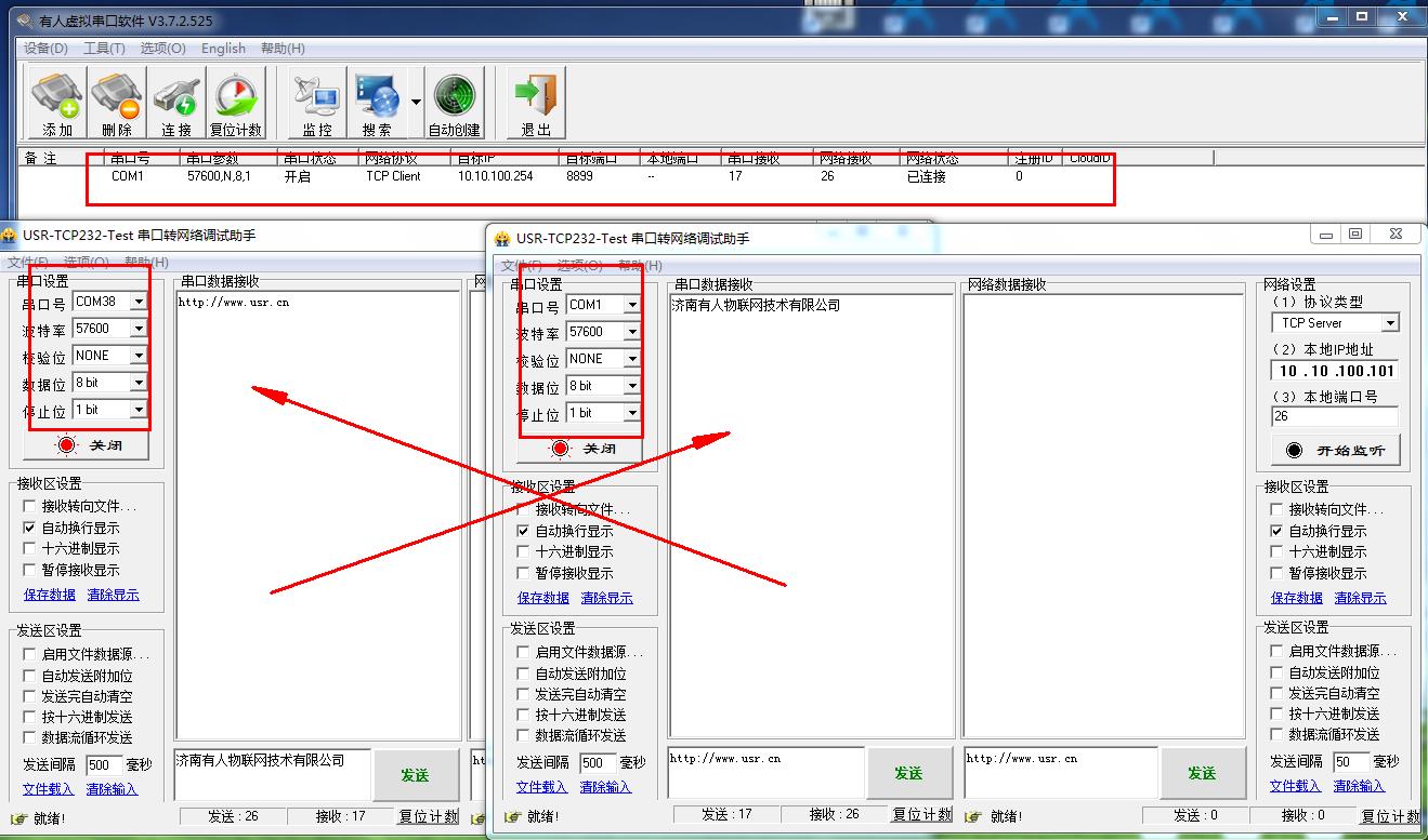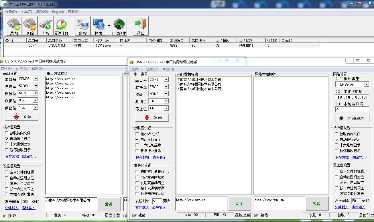 然后用两个USR-TCp232-TEST测试串口和虚拟串口之间的数据传输。