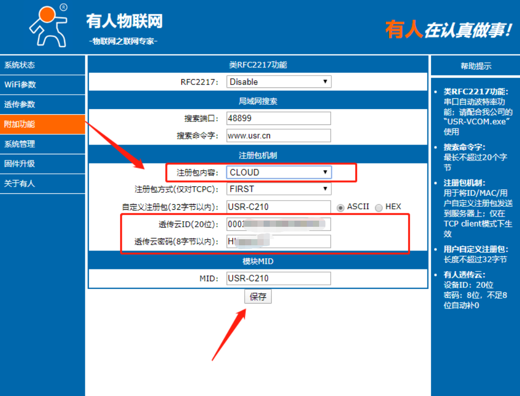 14、进入附加功能,注册包选择透传云,填上透传云上新建立的设备id,和密码(如下图所示),点击保存。