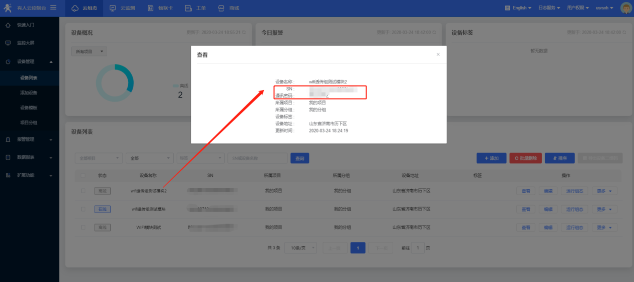 16、依据第11~15步,让第二个wifi模块入网,第二个模块的设备ID与通讯密码填写位透传云模块2的SN与密码,配置完模块重启, 第二个模块在云端显示上线。