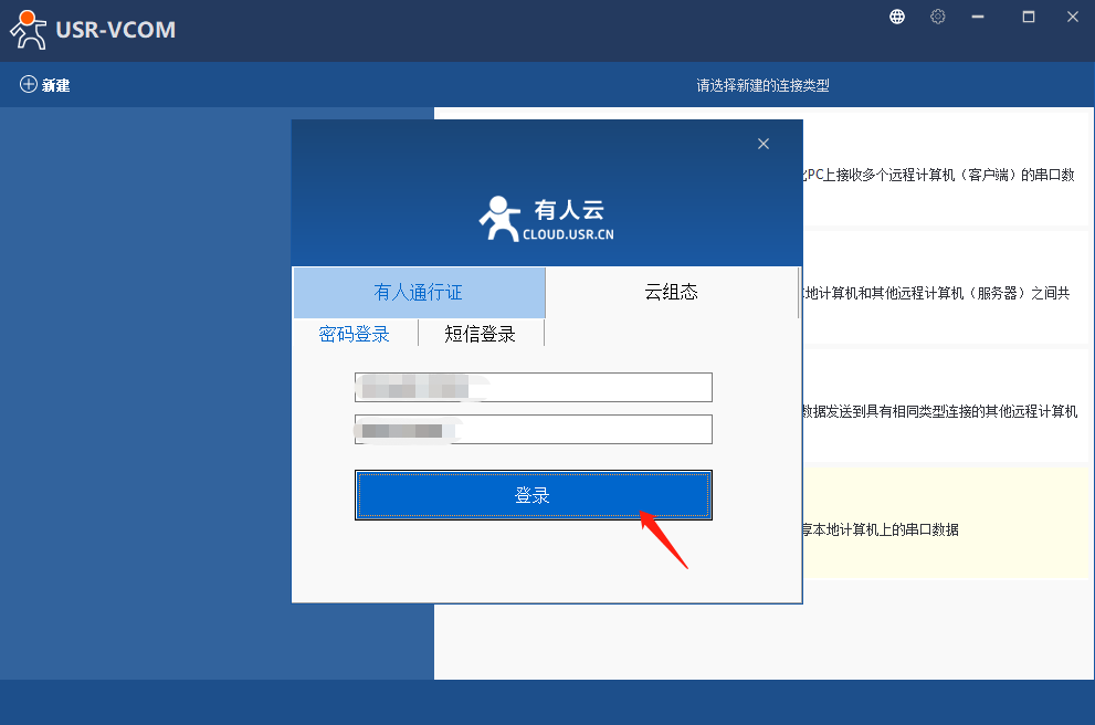 打开虚拟串口软件,点击新建云设备-Vircom连接。在跳出的登录页面登录自己的有人云账号。