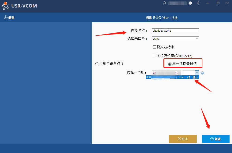 24、自定义连接名称,选择要虚拟的串口,点击“与一组设备通信”,选择在云端生成透传组,点击新建。