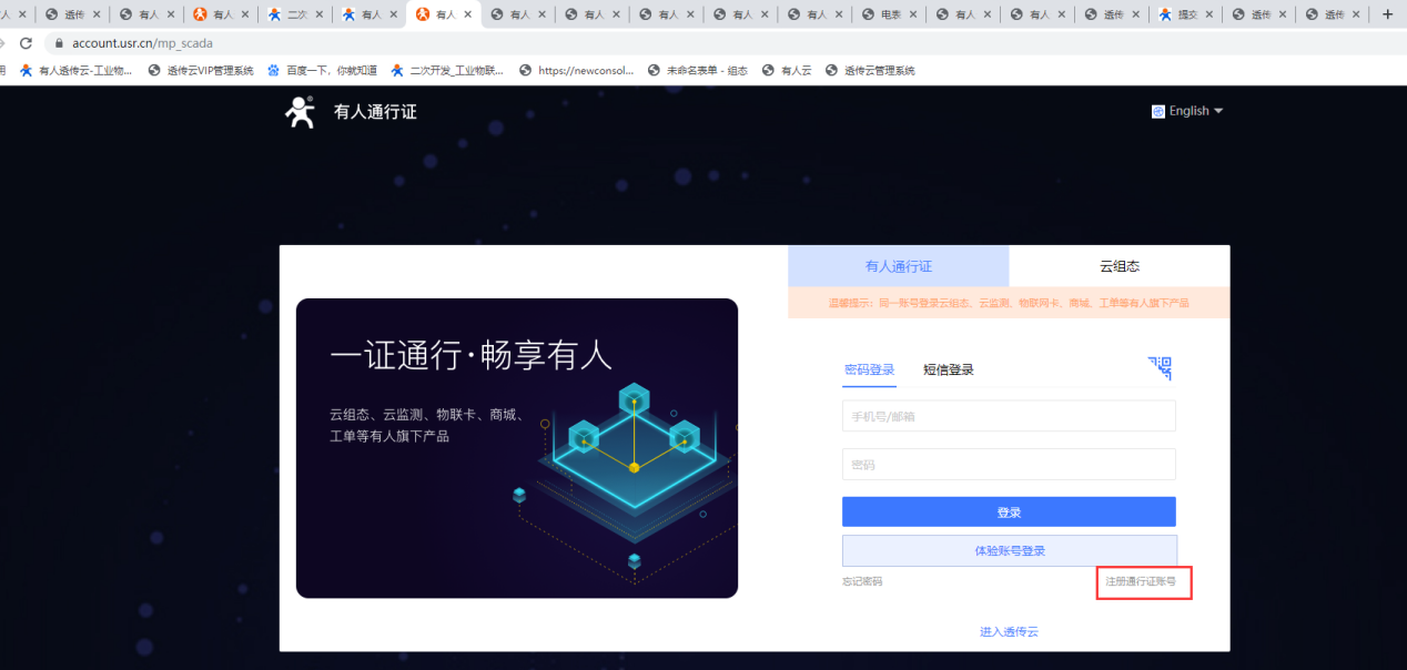4、可以重新创建云组态,如果以前使用过透传云可以直接绑定透传云的账号,由此界面绑定物联网卡平台,工单系统,云检测,和商城。