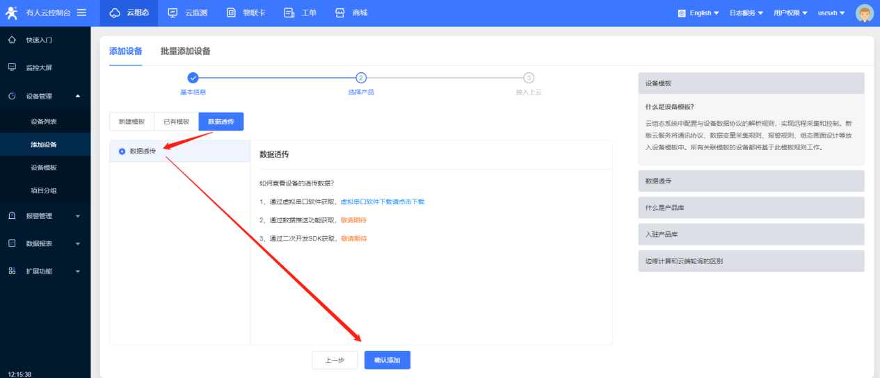 5、本次案例是C215连有人云进行数据显示,可以进入云组态,选择添加设备。