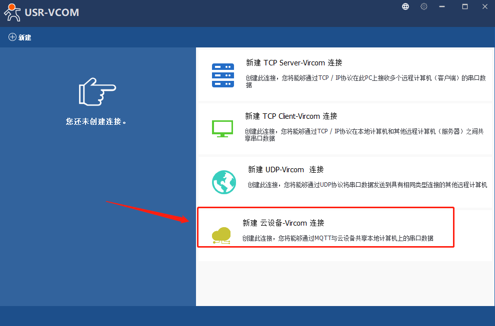 16、打开下载好的VCOM软件,点击 新建云设备。