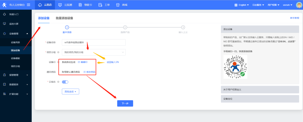 6、添加设备时,自定义设备名称“wifi透传组测试模块”,wifi模块目前只能使用ID方式添加设备id,不能直接使用SN码添加设备, 点击“没有SN,点这里”,使用设备id和密码默认添加就可以,点击一下步。